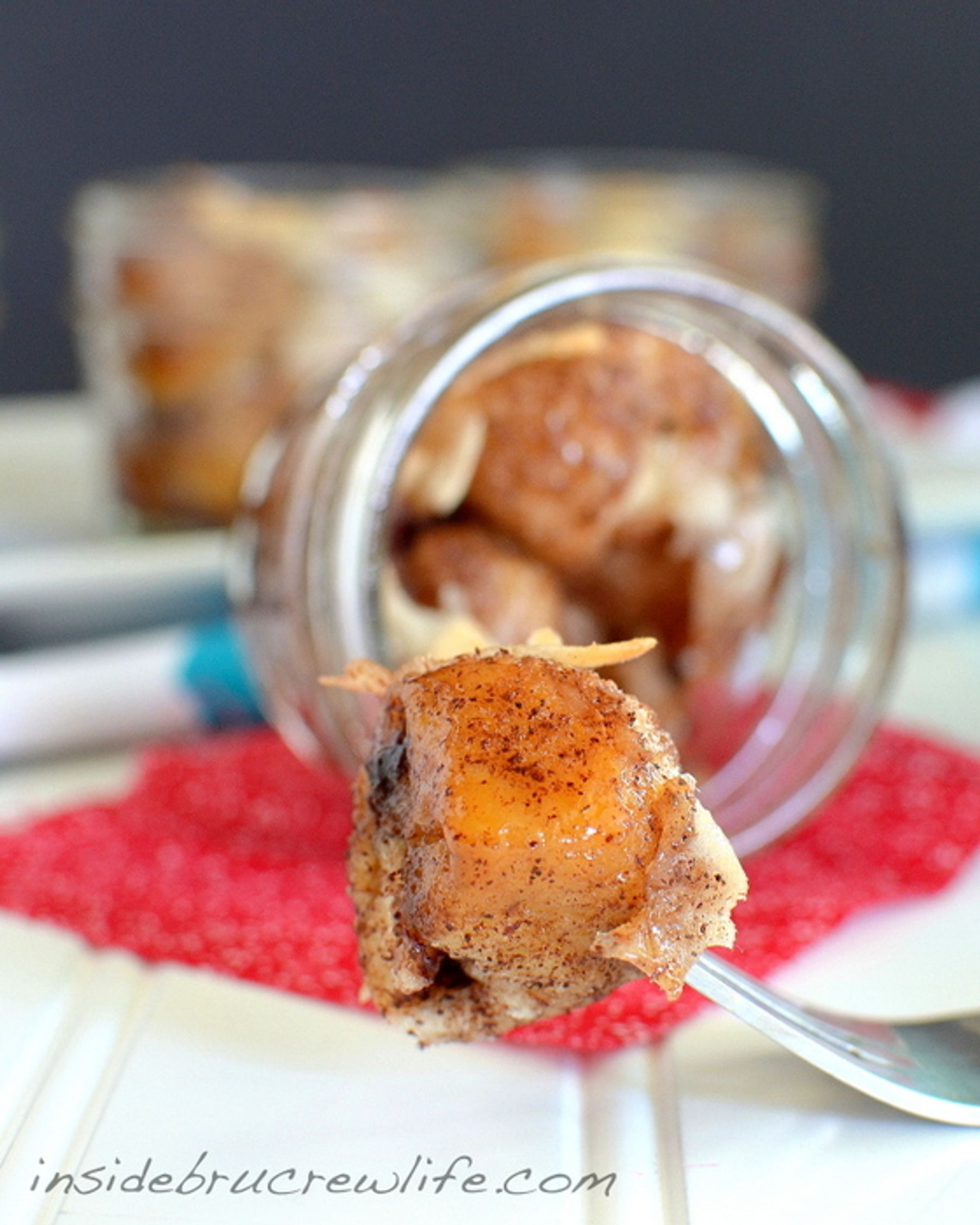 Spray small glass canning jars with non stick spray and set aside. Stir together the 2 sugars and the cinnamon in a bowl. Cut each biscuit into 4 pieces. Flatten each piece and place a small amount of the...