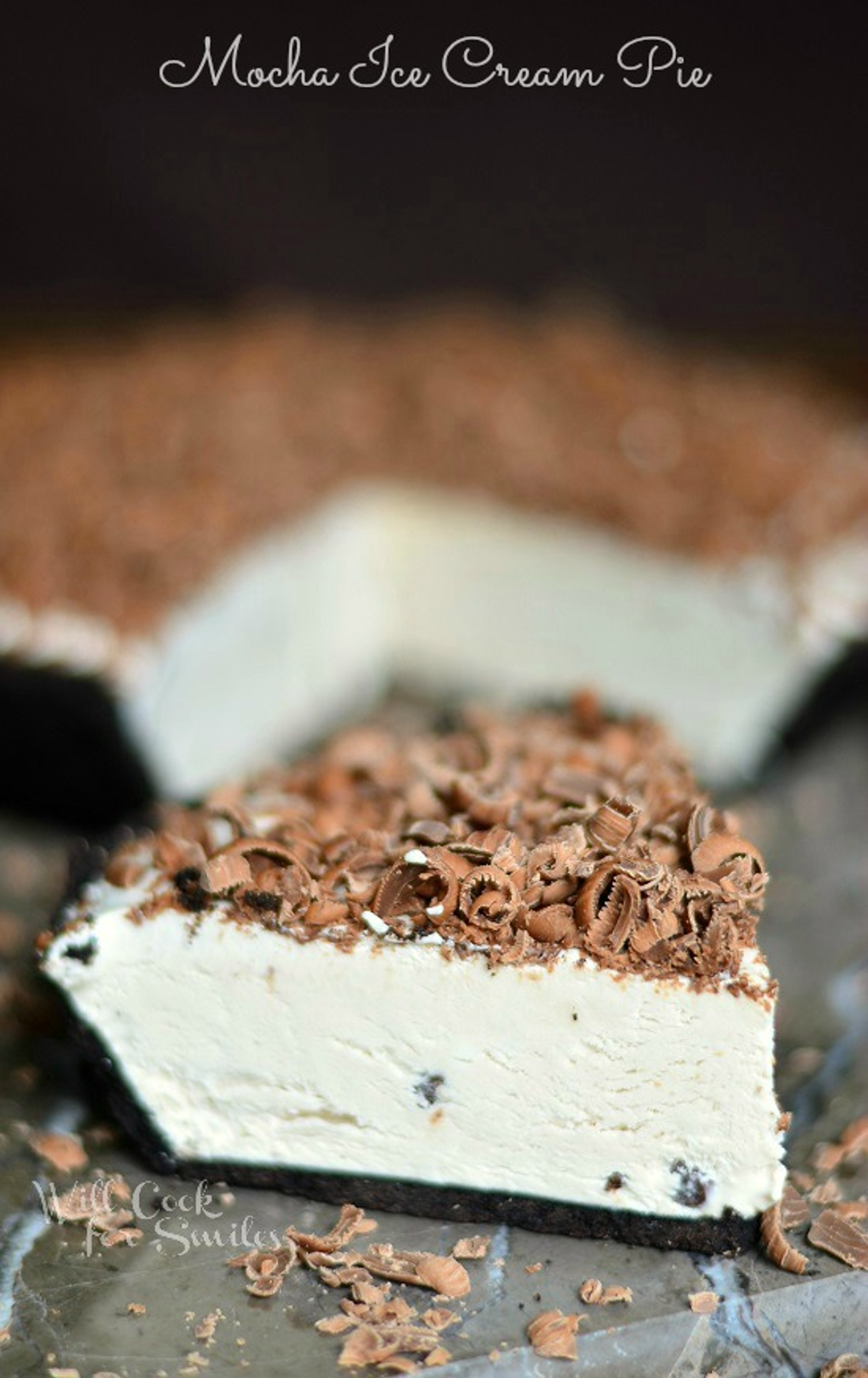 This is a heavenly cream pie that I hope you will try right away! Mocha Ice Cream Pie is actually a cream pie made with iced coffee, mini chocolate morsels, topped with shaved milk chocolate and it’s frozen!