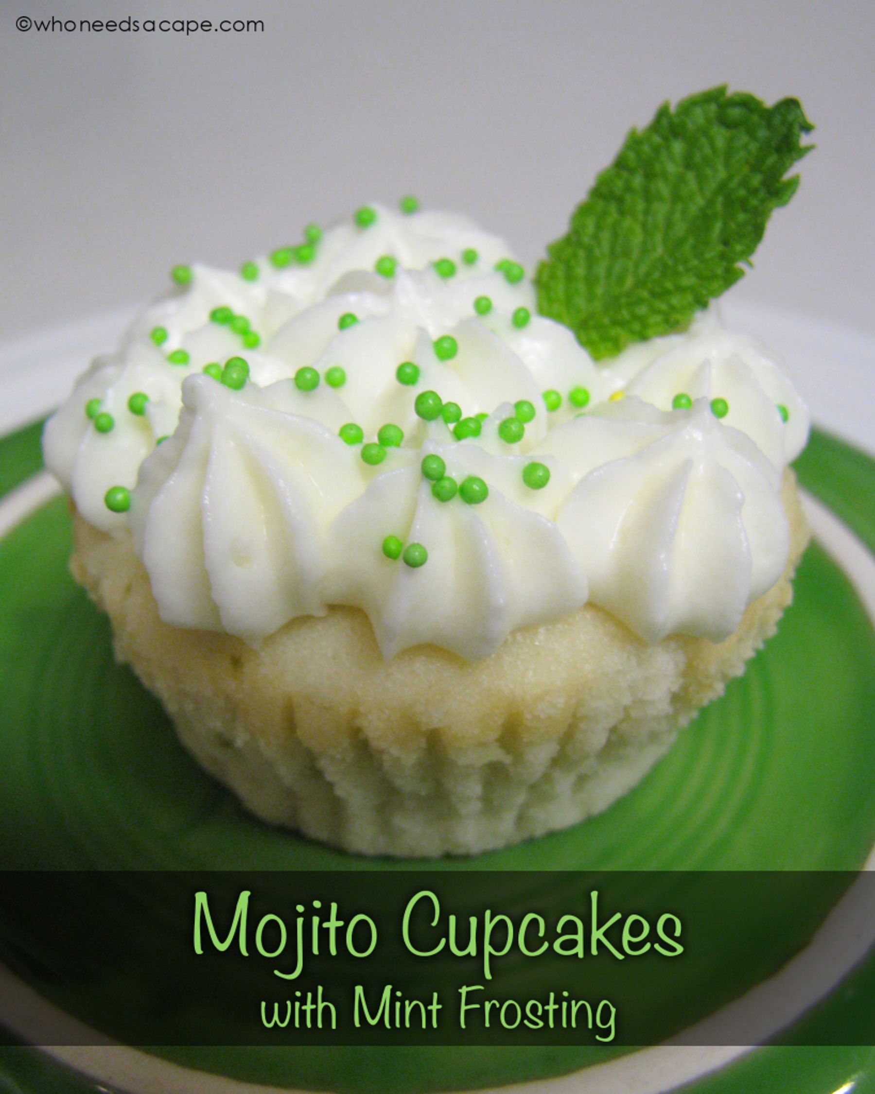 I’m sure most of you have tried the tasty highball drink made with rum, muddled mint leaves, sugar and lime. If you haven’t tried it, you’re missing out! Inspired by the mojito (pronounced “moHEEtoe”) these cupcakes are a nice switch from the usual mint goodies that are abundant as St. Paddy’s Day approaches. Or, make mini cupcakes to serve at a spring tea. Or … well, Cinco de Mayo isn’t *that* far off, right? I used the 1-2-3-4 cake recipe found on the back of the Swans Down® cake flour box as