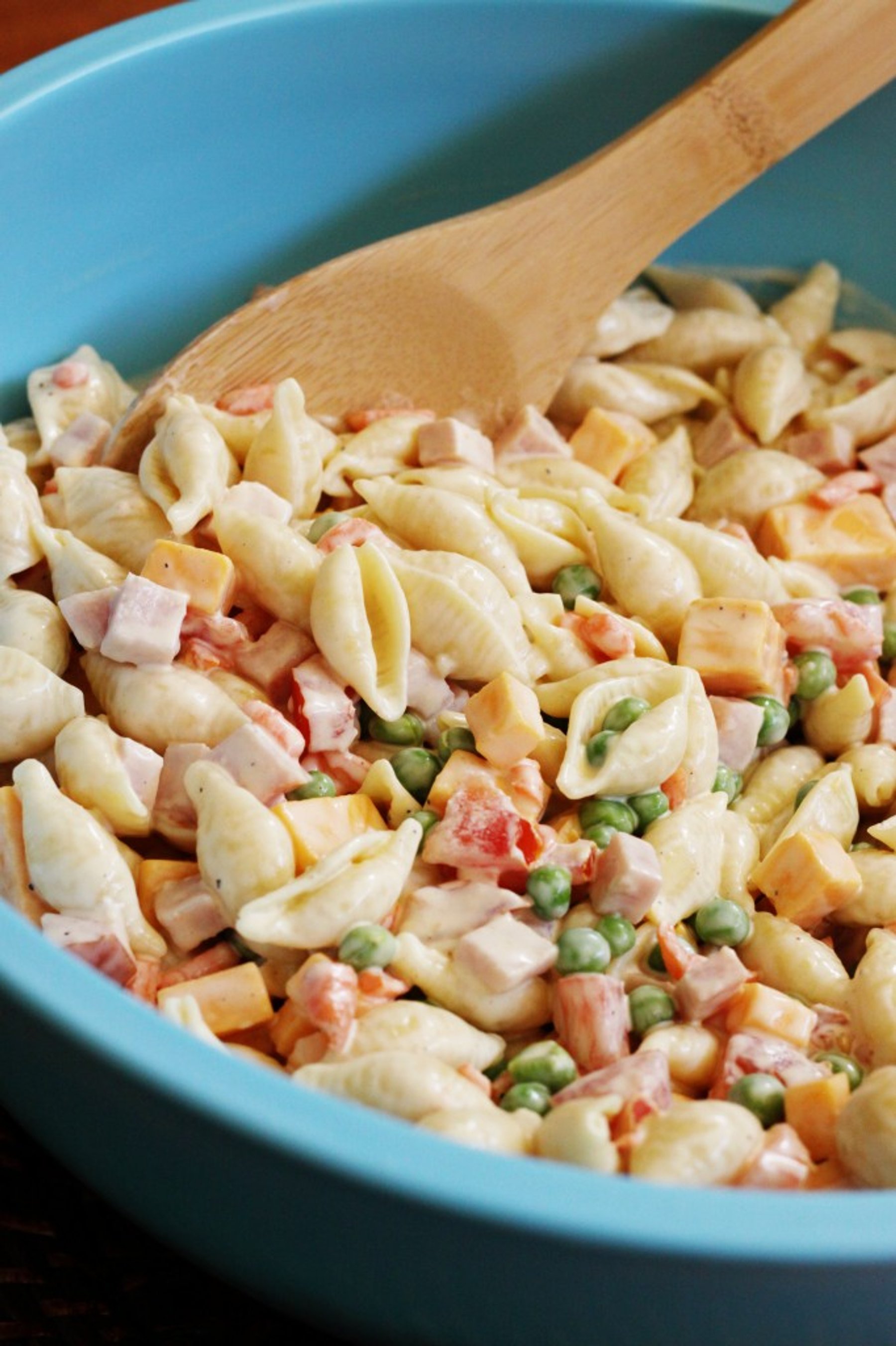 I am not typically a fan of macaroni salad.. unless it is my Mom’s. I know the picture above shows this salad made with the little shells.. macaroni or shells, it all tastes the same. My family for some reason prefers shells to macaroni so that’s what we did. We would always have this at family picnics or trips to the lake. I feel like every time we had it, there were different mix-ins depending on what she had on hand. A few things were always the same though: cheese, ham, and peas.