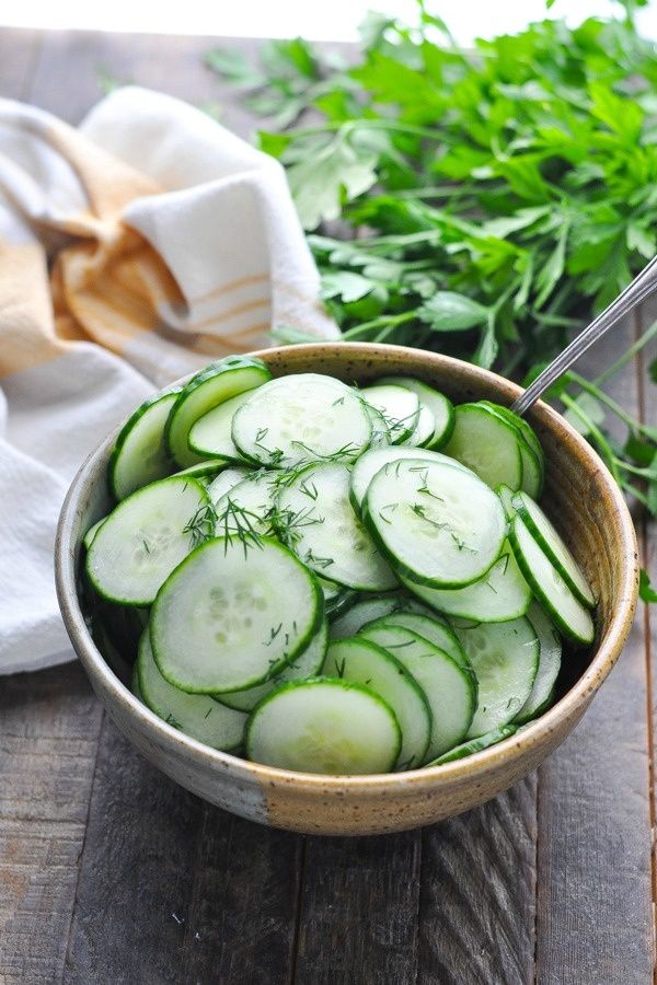 Mom's recipe for Cucumber Salad with Vinegar is a healthy and easy side dish to pair with any summer meal. Thinly-sliced, fresh cucumbers are marinated in a sweet and tangy dressing made with vinegar, sugar and a touch of fresh herbs. Refreshing, easy and absolutely delicious!