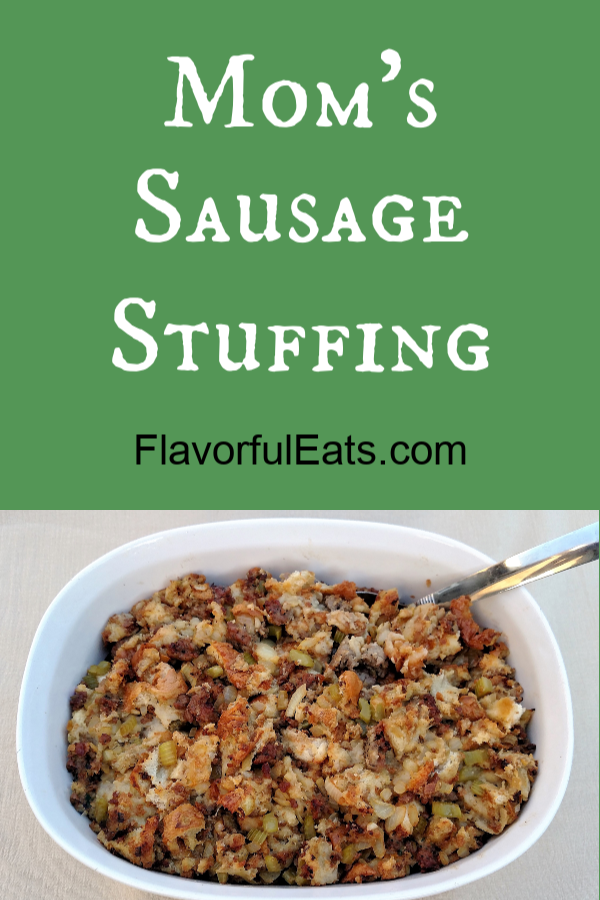 Mom's Sausage Stuffing is a homemade stuffing made with sausage, onion, garlic, celery, hand-torn bread, and plenty of spices. It's always a big hit and Thanksgiving wouldn't be complete without it!