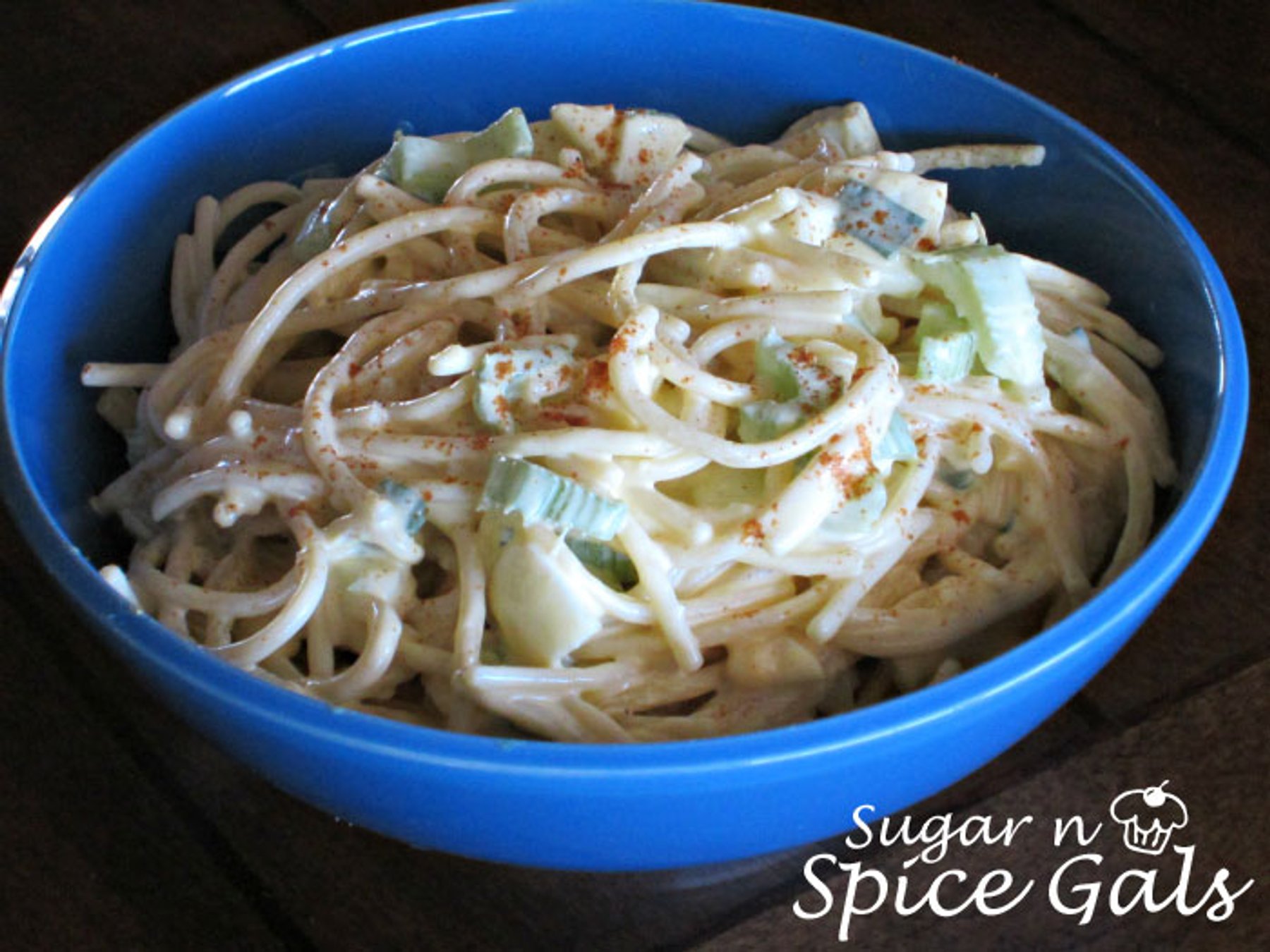 Break the spaghetti into thirds then cook according to package directions. Rinse in cold water. Mix together the mayonnaise, mustard, vinegar and sugar in a bowl. Toss the spaghetti, celery, green onions,...