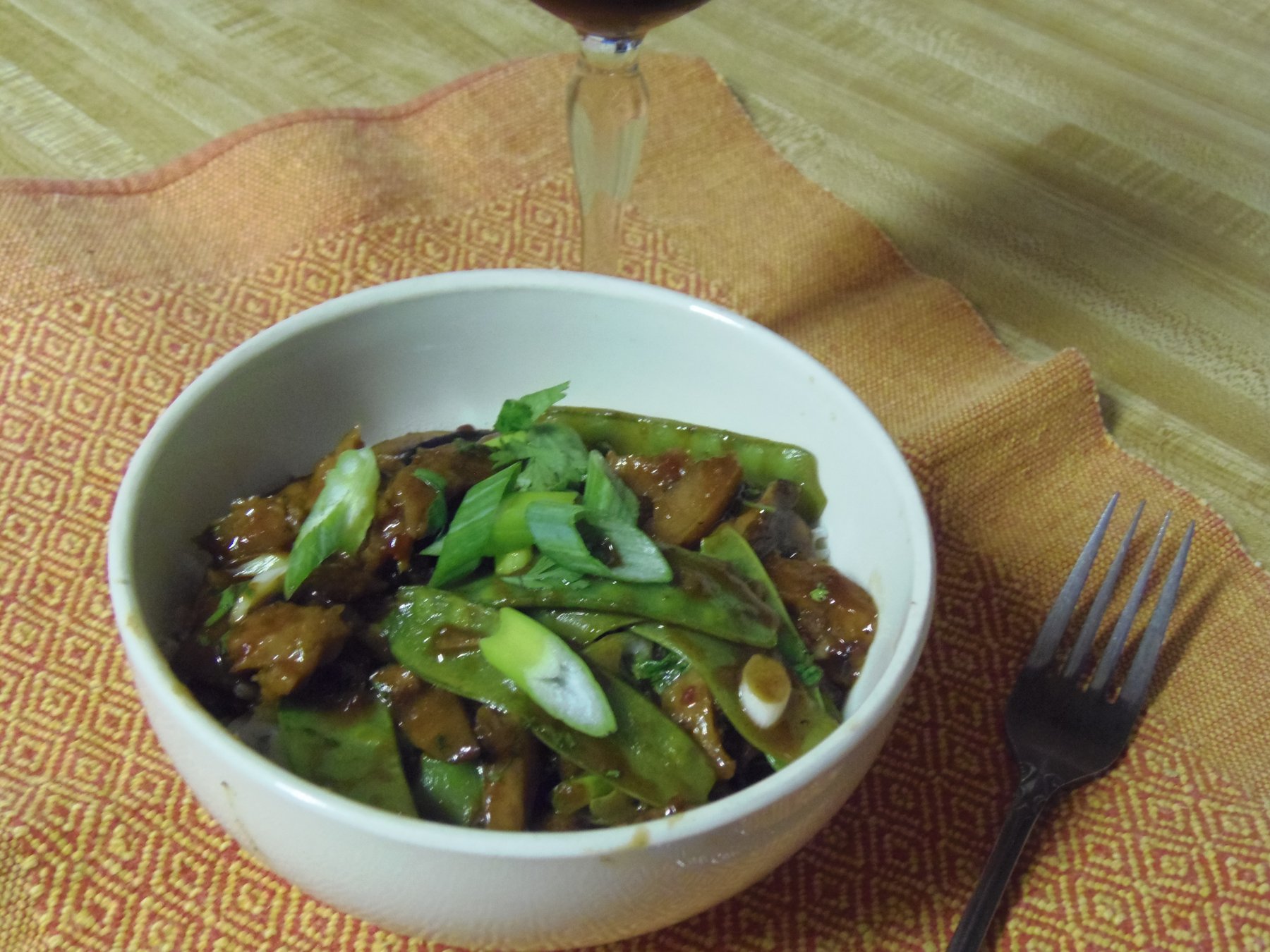 A seitan and mushroom dish served over rice with a delicious Asian BBQ sauce.