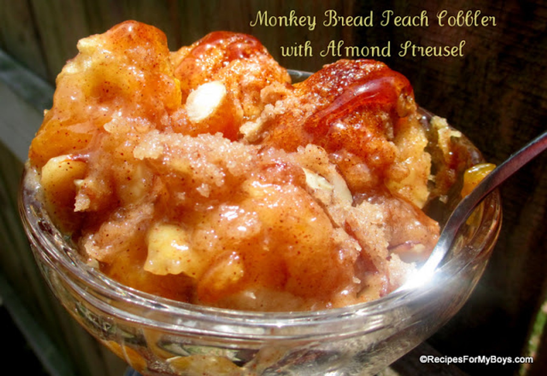 Buttery, cinnamon bites of Monkey Bread with rich, sweet goodness of Peach Cobbler topped with Almond Streusel!