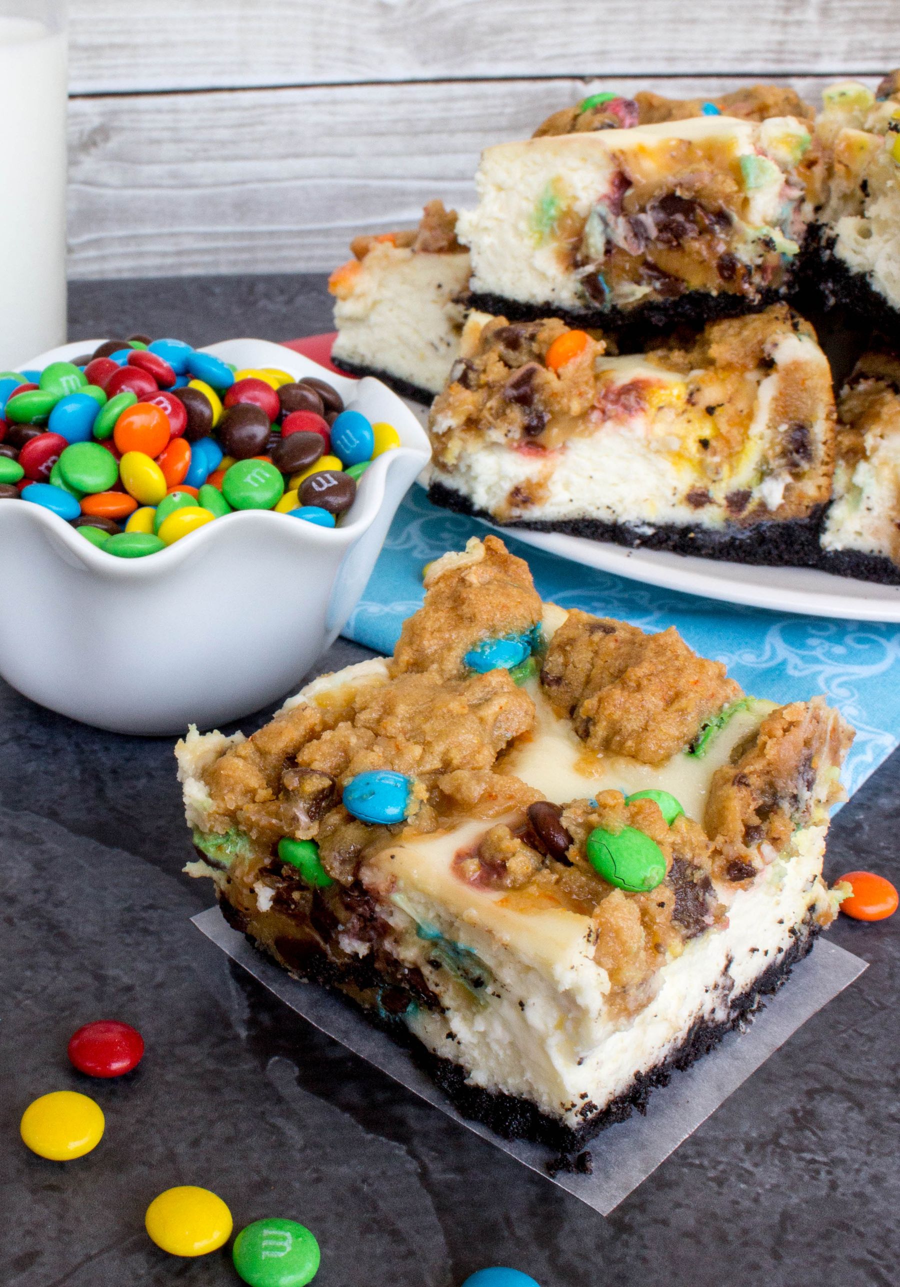Classic cheesecake made on an Oreo cookie crust and filled with clumps of monster cookie dough, these Monster Cheesecake Squares are a fun, new way to enjoy cheesecake and cookies together.