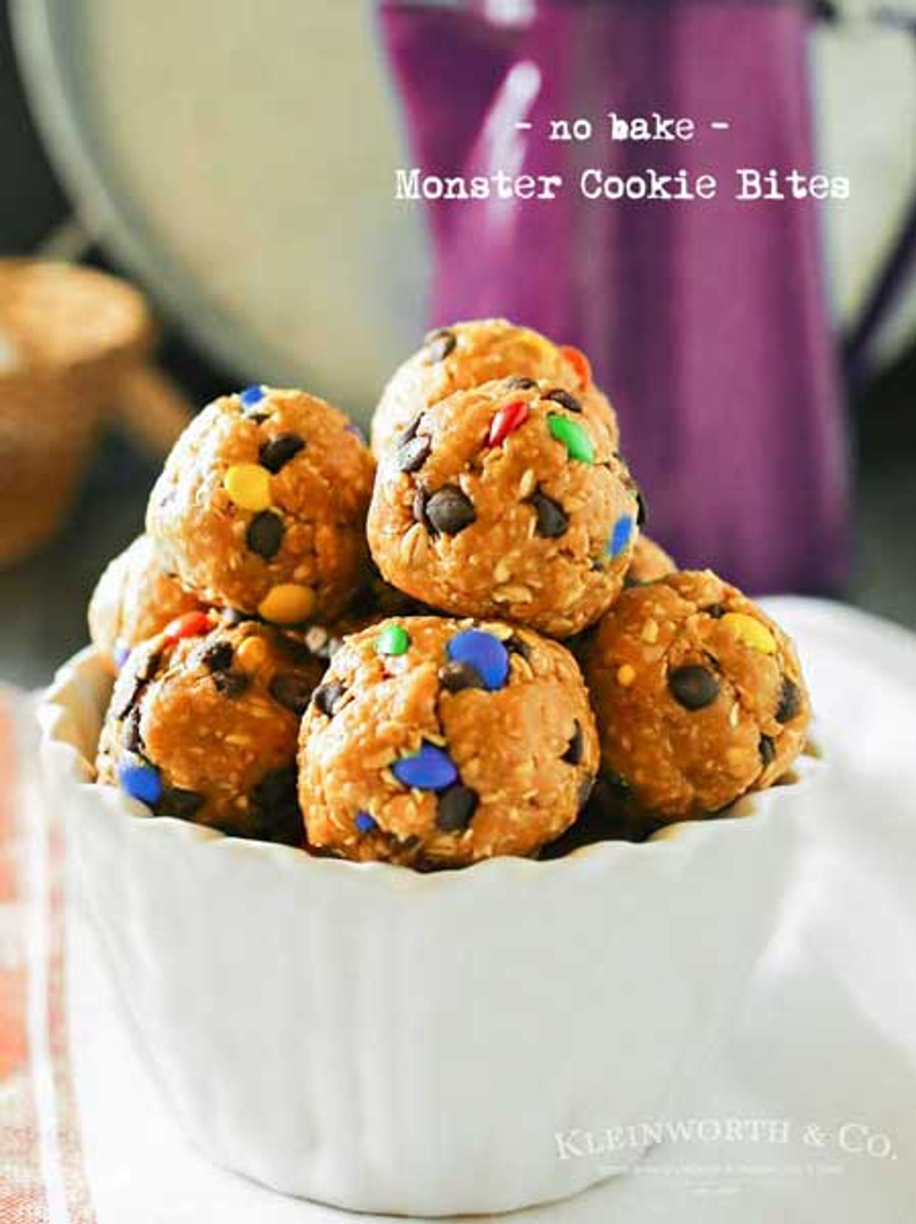 Monster Cookie Bites are an easy no-bake dessert that any M&M lover will ask for time & time again. Oats, peanut butter & honey make these a great snack!