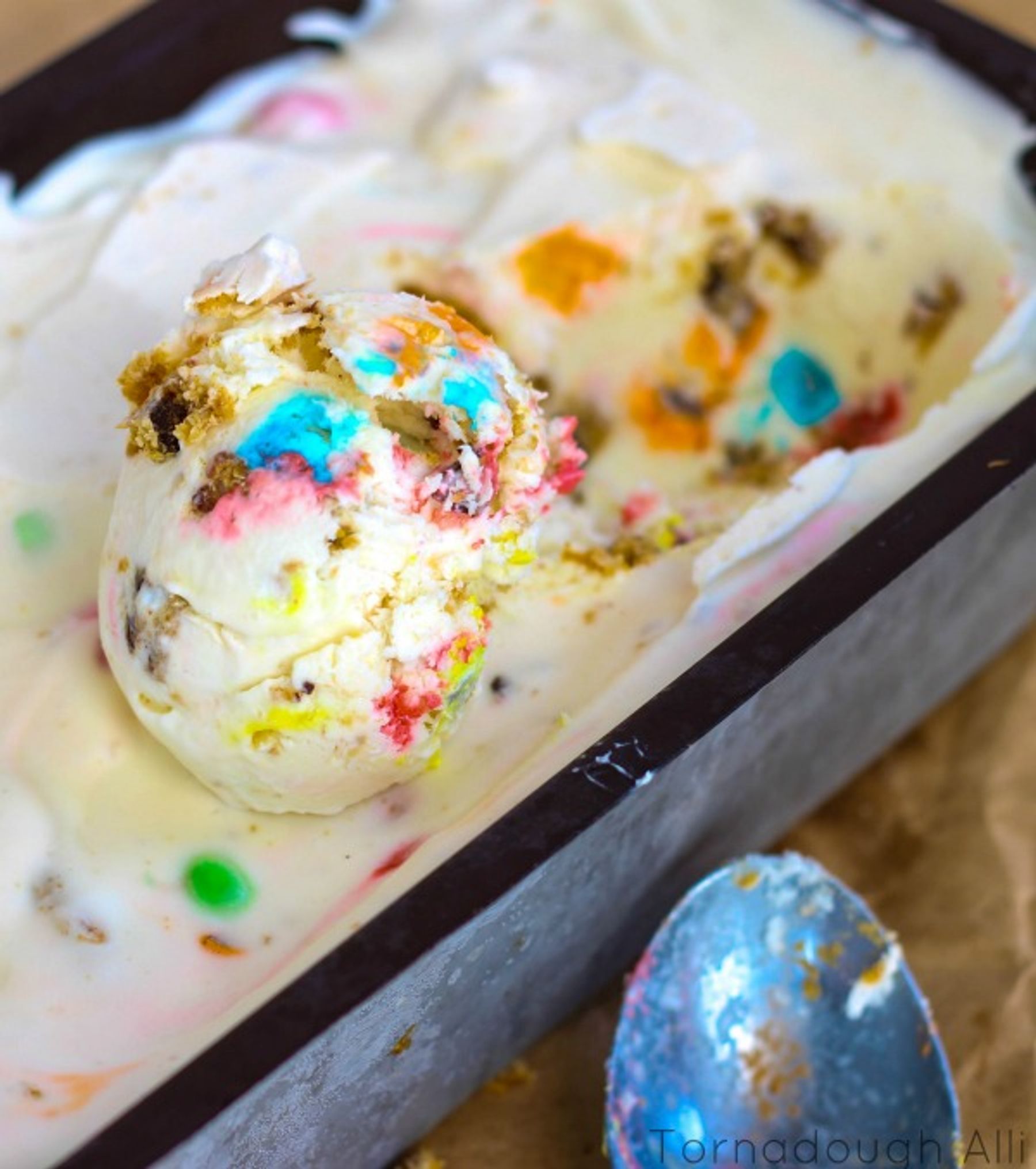 Creamy no-chrurn ice cream laden with soft oatmeal choolate chip cookies and peanut butter M&M\\\'s.