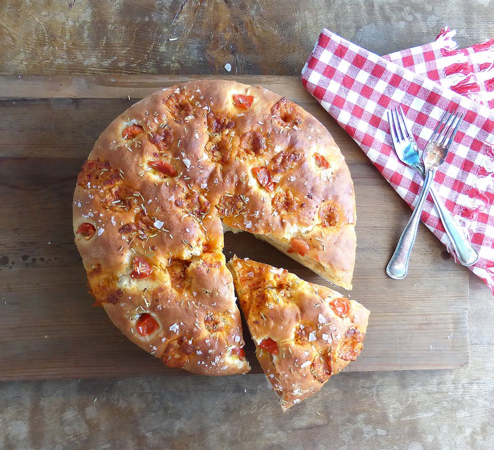 Monterey Pepper Jack Spelt Focaccia Bread (with Tomatoes and Rosemary)