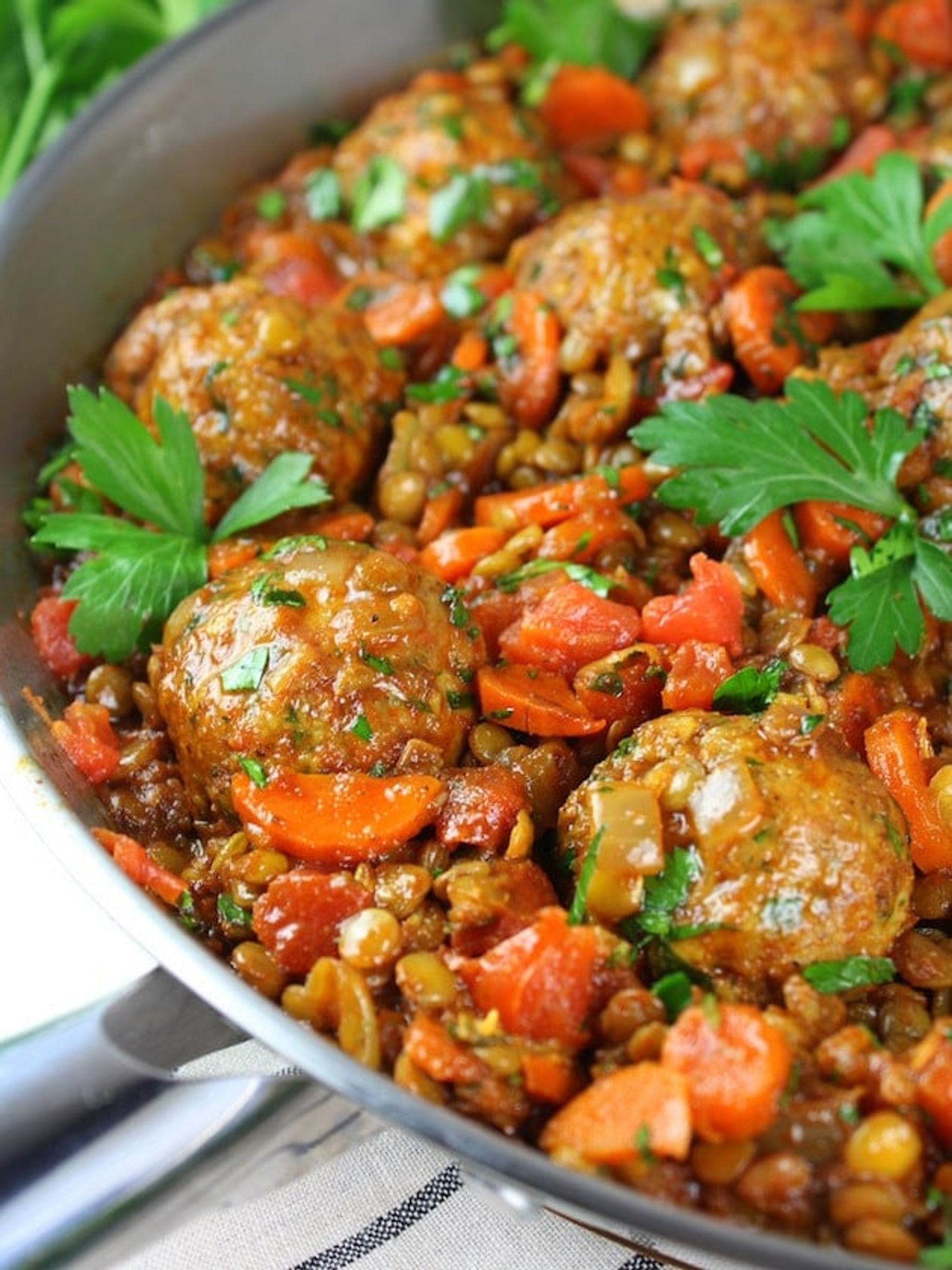 A delicious, hearty meal with the most delightful flavors! With green lentils, tomatoes, parsley, warm Moroccan spices, & homemade turkey meatballs.