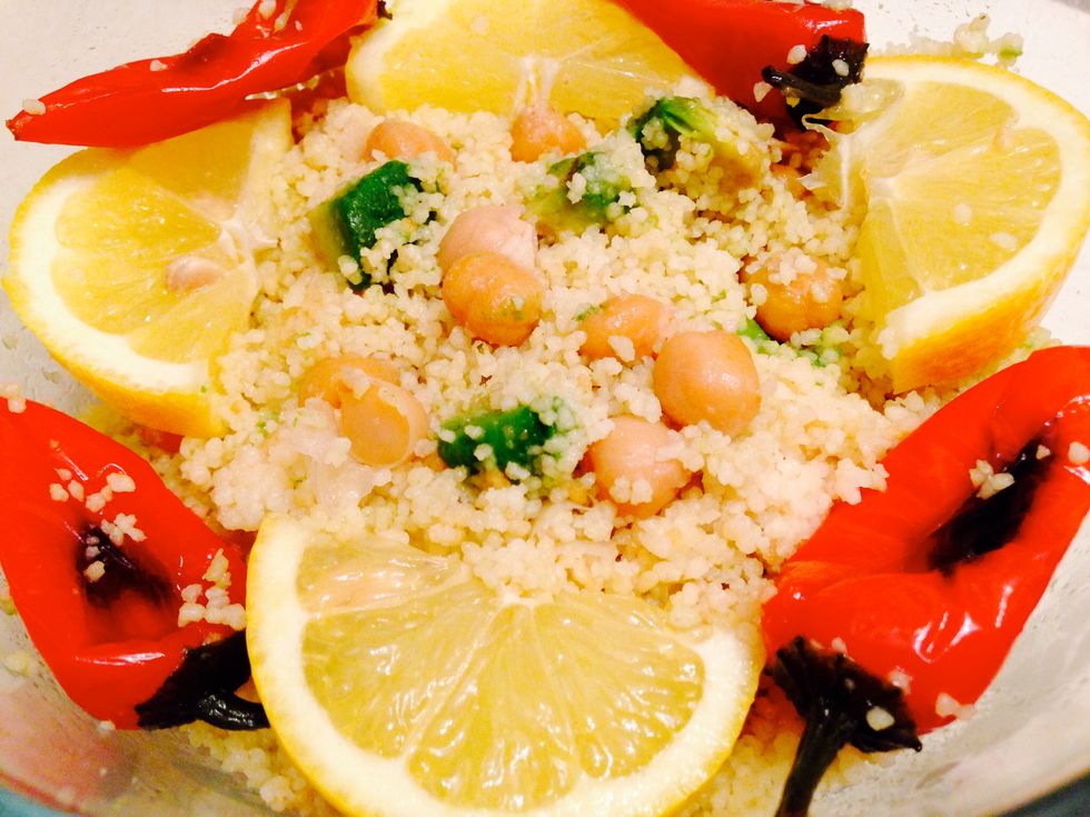 Grilled baby peppers, avocado and chickpeas couscous salad.