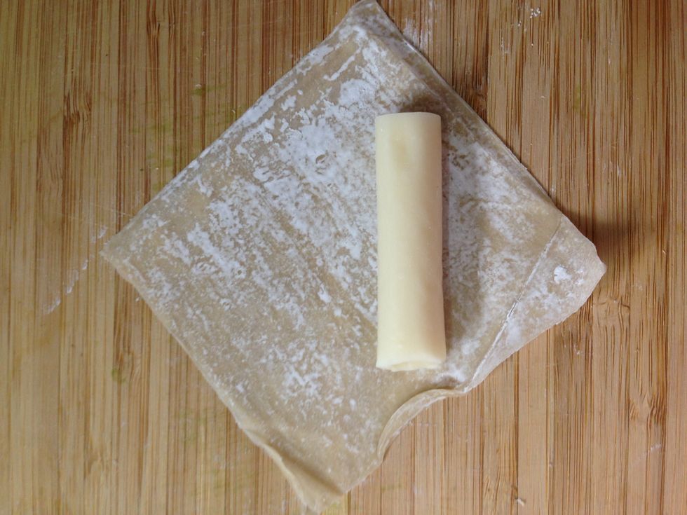 To assemble mozzarella sticks, place a wonton wrapper on the counter in a diamond shape. Place the string cheese at the bottom of the diamond.