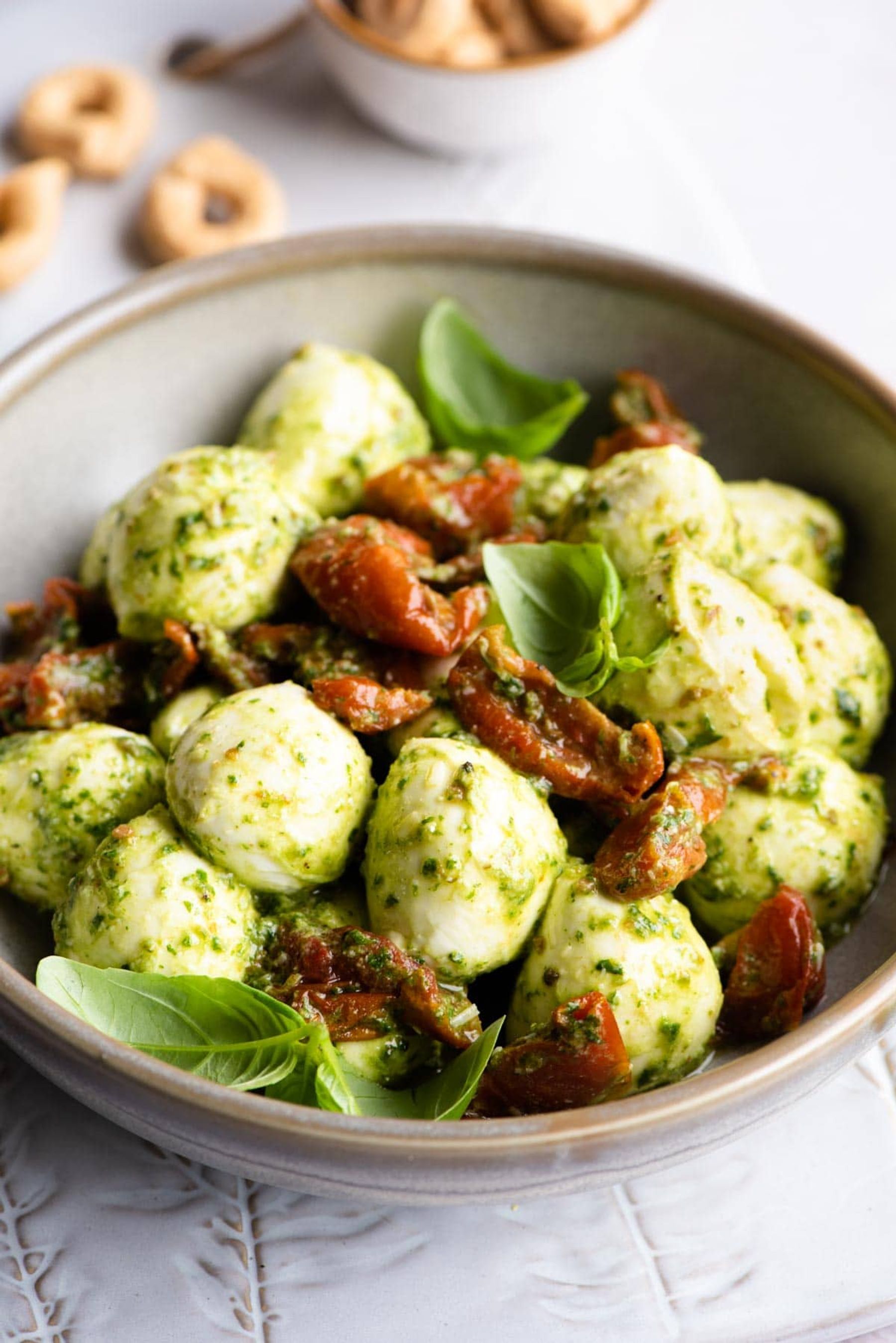Mozzarella Bocconcini balls tossed with homemade basil pesto and sun-blushed tomatoes. A perfect light lunch or antipasto.