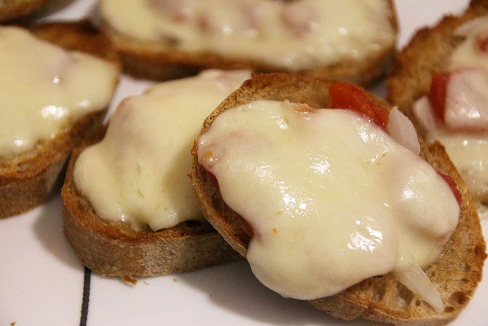 The addition of melted mozzarella takes this bruschetta over the top in the best way possible.