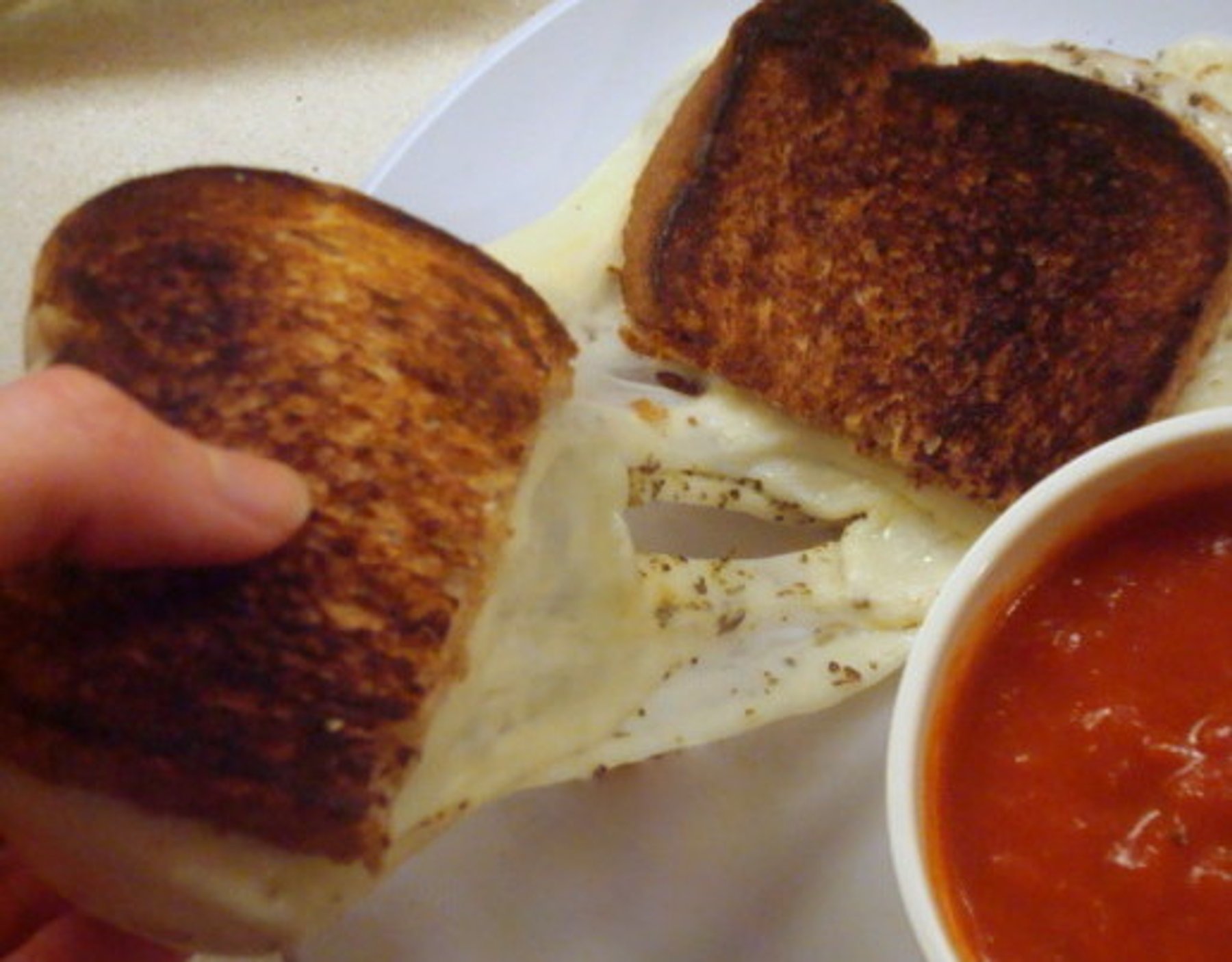 Place slices of mozzarella on both slices of bread. Layer garlic and herbs onto one side and close to make a sandwich. Whisk egg and salt together in a shallow bowl. Melt butter in a skillet over medium-...