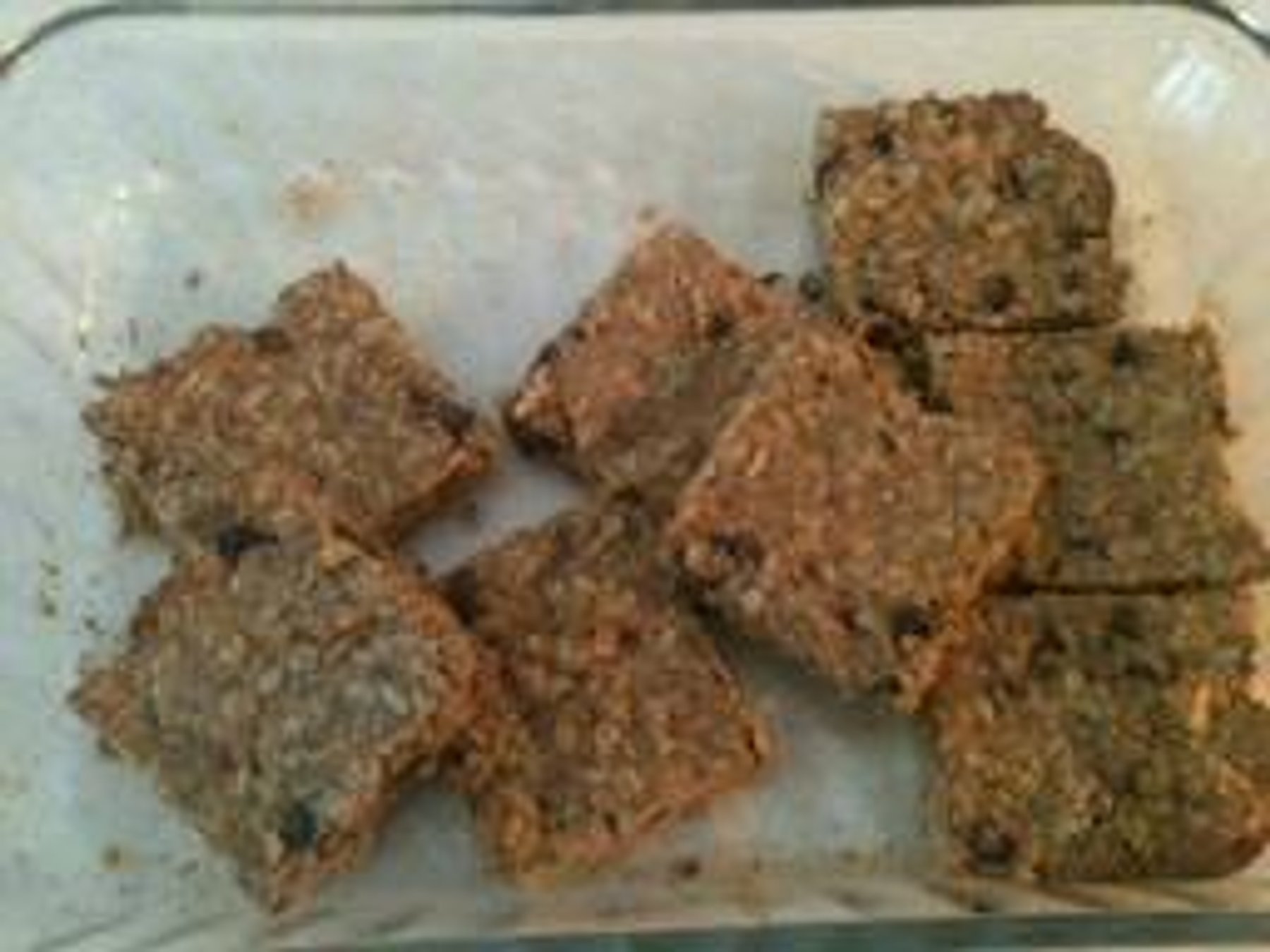 Combine nut butter and honey, mix well. Add one ingredient at a time, mixing well after each. Bake at 350 in a 13 x 9 greased pan for 15-20 minutes or until golden brown. Let cool completely before trying to cut. You can try different ingredients for everything below the nut butter. Just don't exceed a total of 2 cups. Other variations: wheat germ, protein powder, flax meal, raisins, or dried chopped apricots, pumpkin seeds, etc.