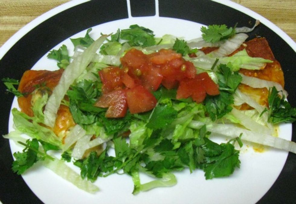 This is a two cheese creamy chicken enchilada dish, topped with fresh vegetables.