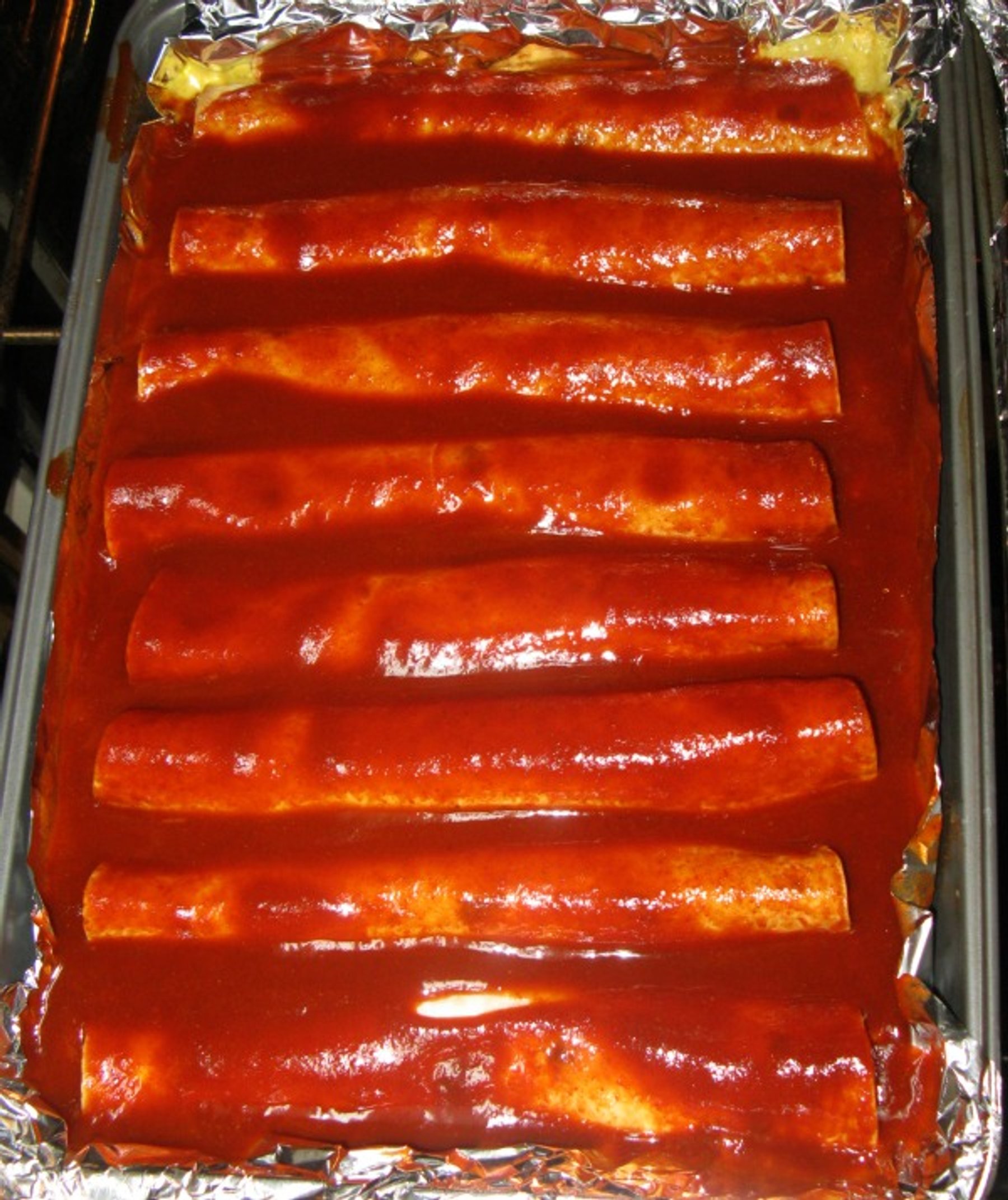 Boil and shred chicken breasts. Mix soup and sour cream. Stir in green chilies, olives and cheeses. Spoon mixture onto tortilla, roll and place in 9 x 13 baking dish. Pour enchilada sauce on top.