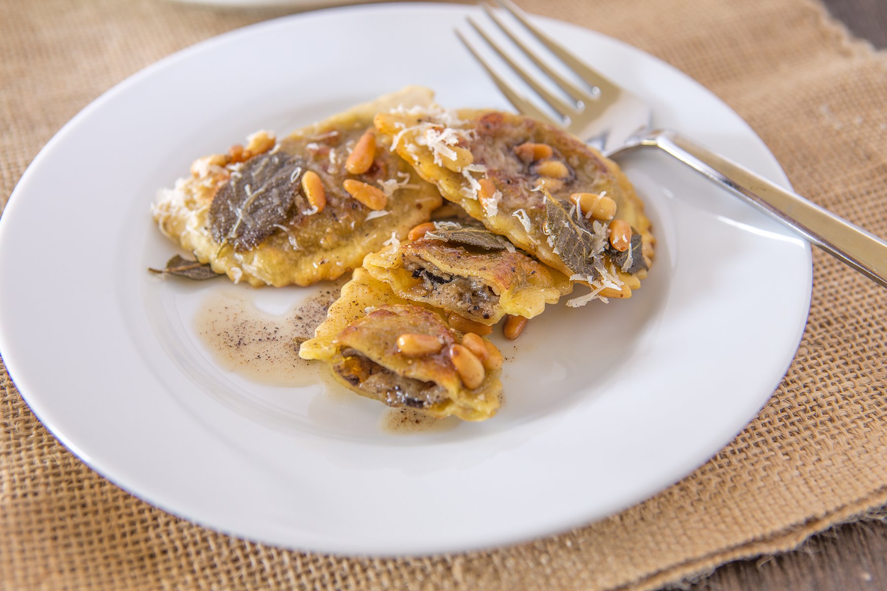 Mushroom agnolotti with sage brown butter. Rich brown butter, sweet pine nuts, and crispy sage leaves served over browned pasta filled with creamy mushroom. So good!