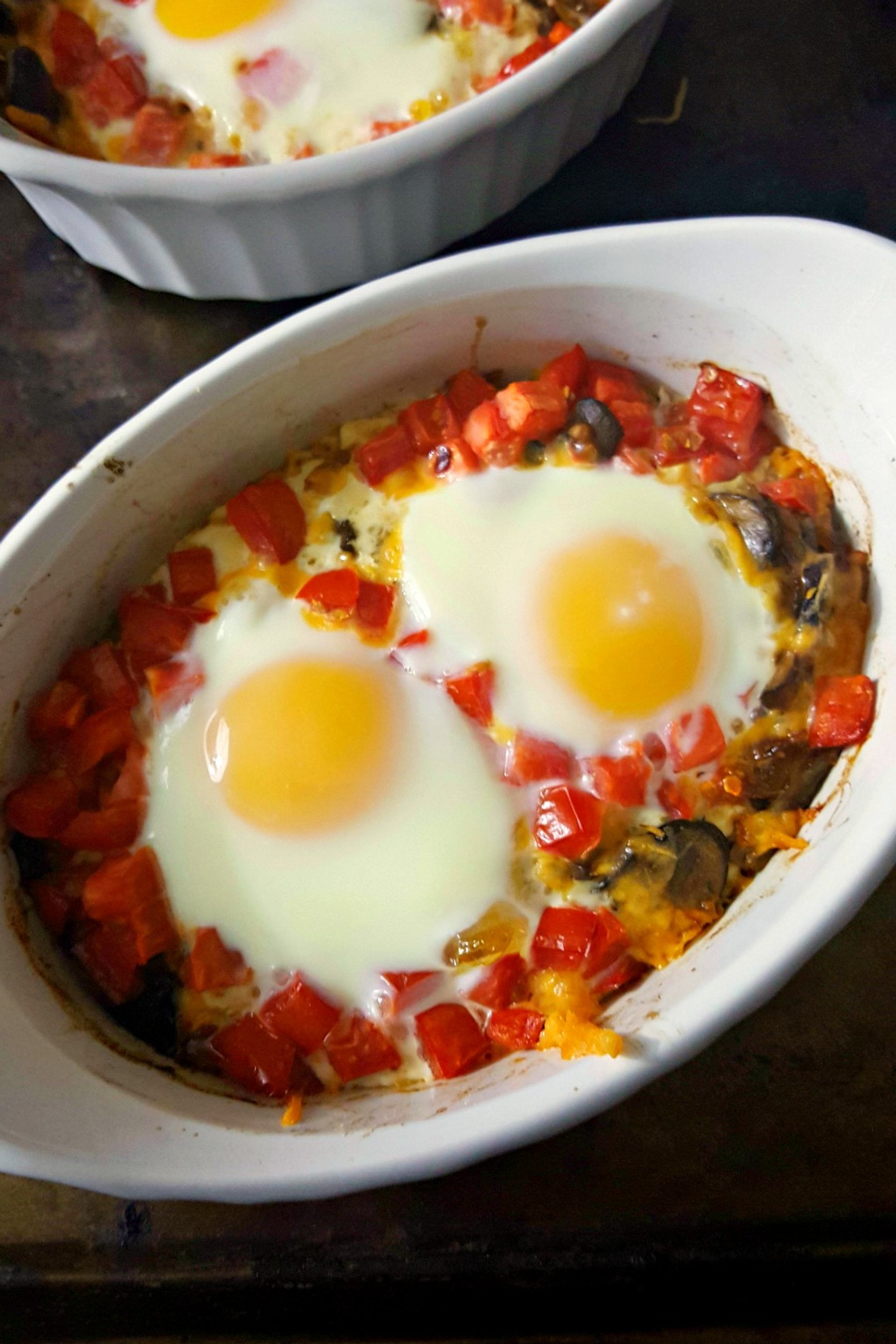 This dish can easily be prepped ahead of time and then it’s just a crack of the eggs before baking. These Mushroom Cheddar Baked Eggs are perfect for breakfast, brunch, or a #meatfree dinner.