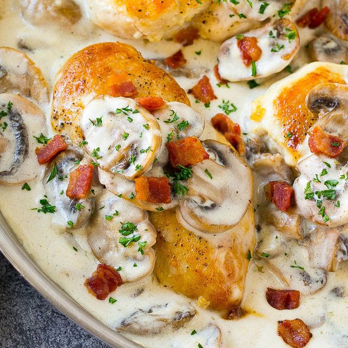 This mushroom chicken is pan seared chicken breasts topped with creamy mushroom sauce and bacon. An easy dinner that tastes like it came from a restaurant!