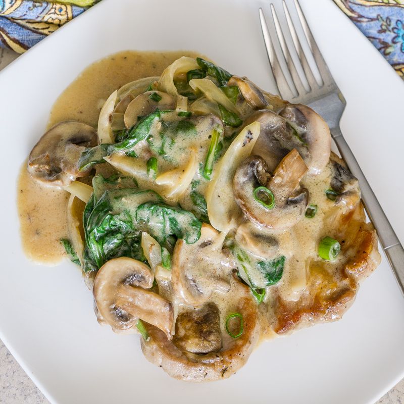 A one-pan dish of tender pork chops in a creamy mushroom sauce with wilted spinach. Gluten-free, and no canned cream of mushroom soup here!