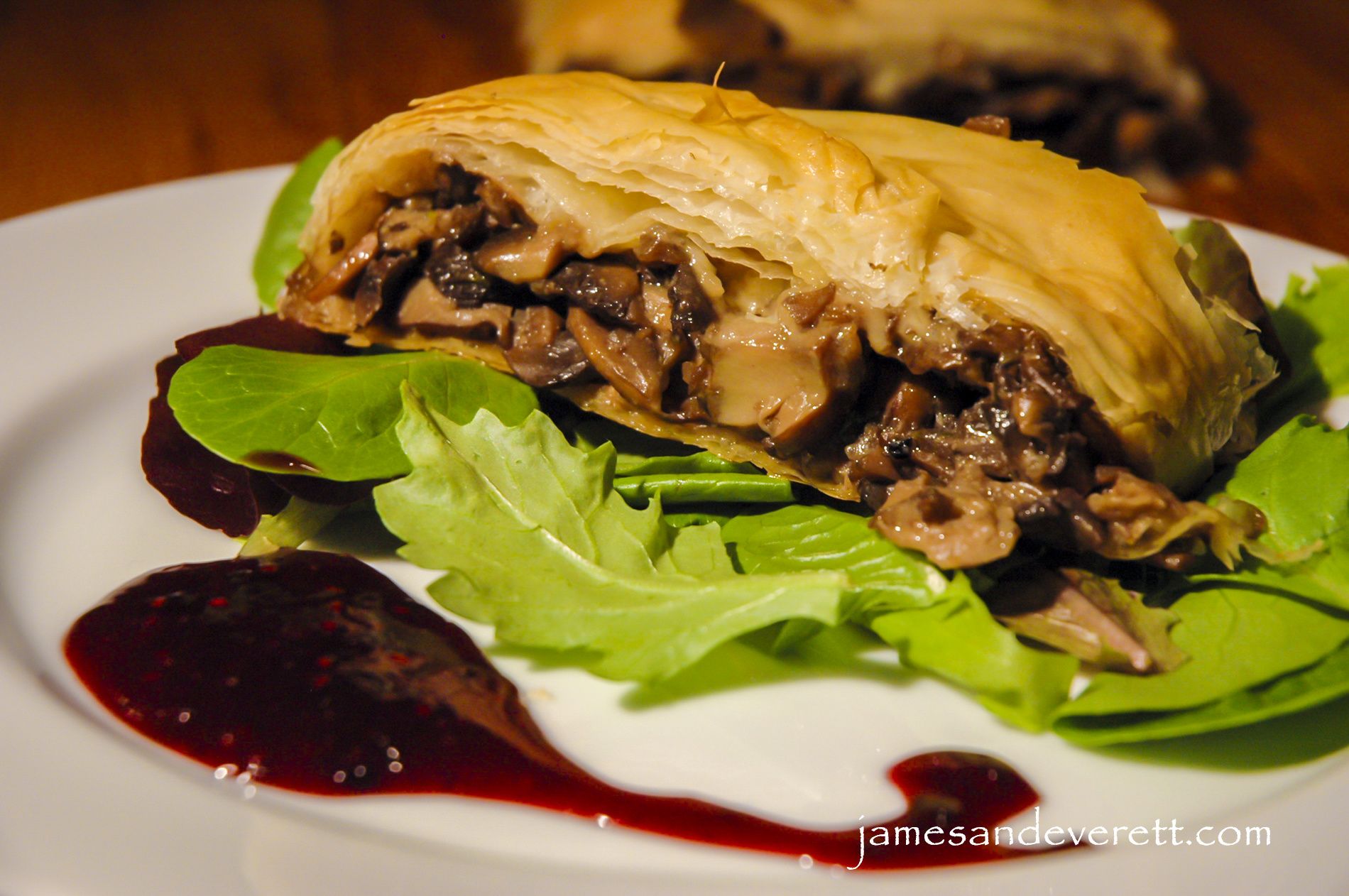 Flaky layers of pastry envelope the full bodied savory and earthy flavor of tender mushrooms. Serve with a berry coulis for unforgettable dish.