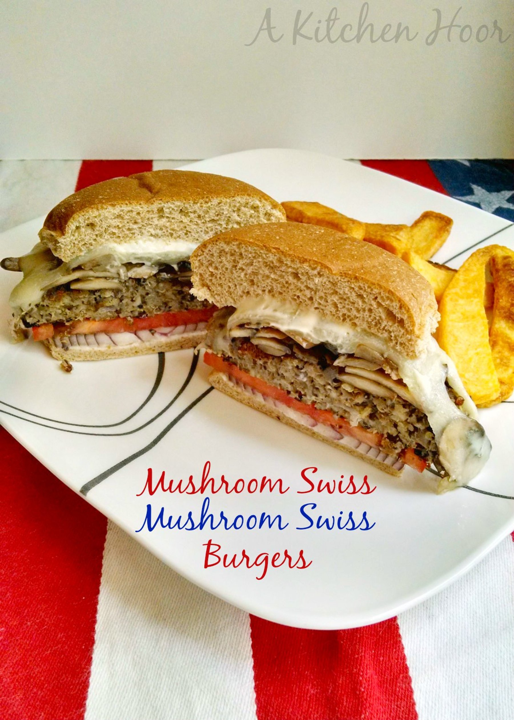 Burgers are the epitome of the welcome mat to summer. Just walk right on in, grab a bun, some chips or potato salad, a burger, and have a seat at the picnic table. These #meatfree burgers have tasty mushrooms and Swiss cheese twice in this #meatless burger recipe.