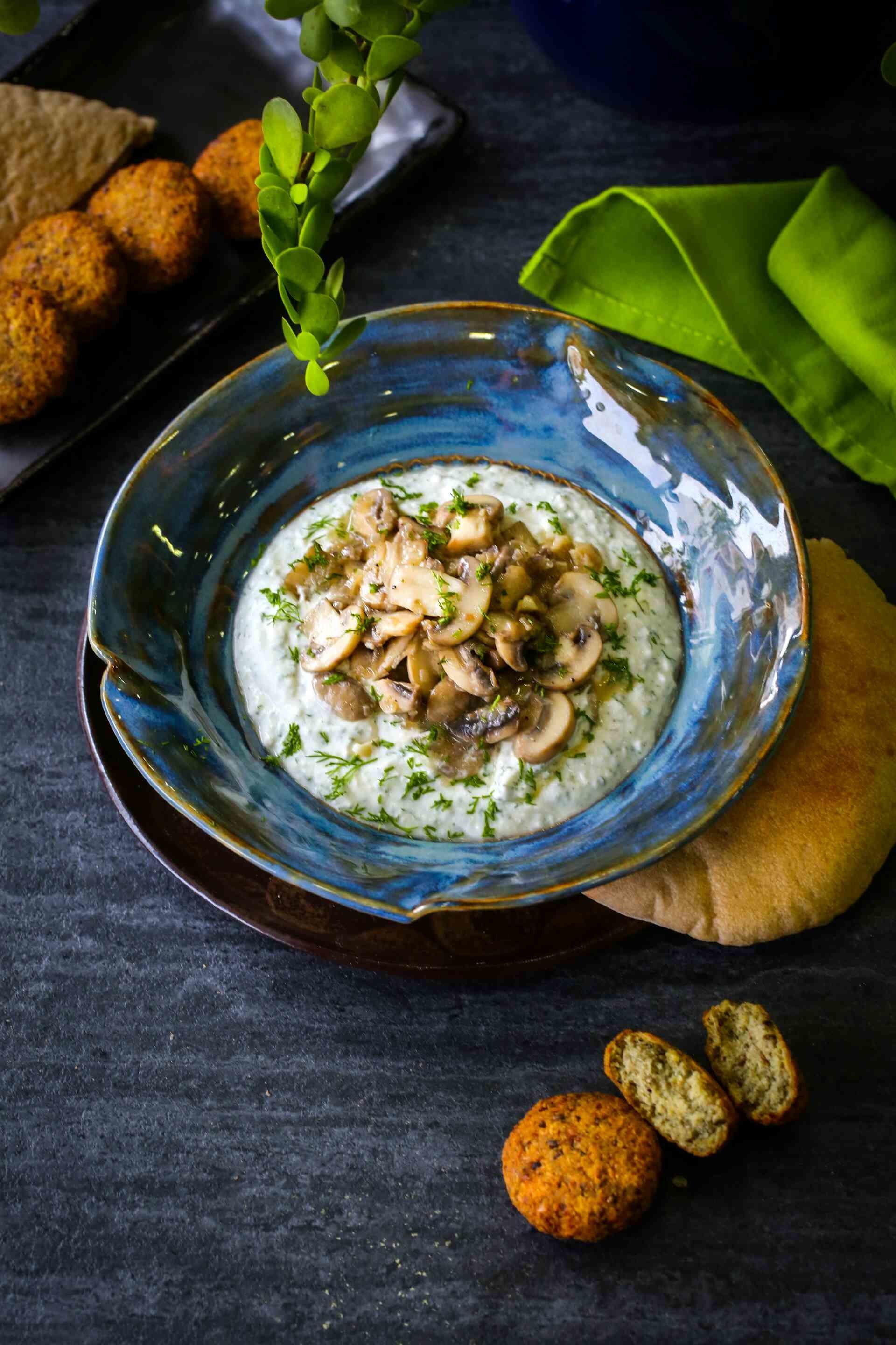 These mushrooms in yoghurt are quick and easy to make, and are a wonderful filling for pita bread with falafel, or in a sandwich.This dish also works as a dip, but is yummy enough just to eat as is! Dill and mint add tremendous flavour to the mushrooms, and I find I can just warm up the leftovers fora delicious yoghurt-based pasta sauce!
