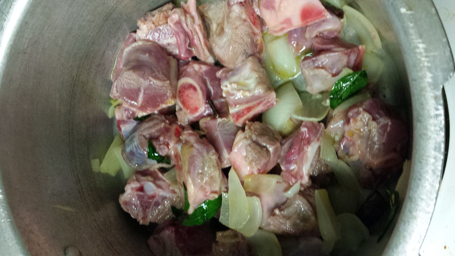 5. Heat oil in pressure cooker,when hot add curry leaves ,cinnamon ,clove and then add mutton pieces and fry for few seconds until the mutton becomes pale in color.