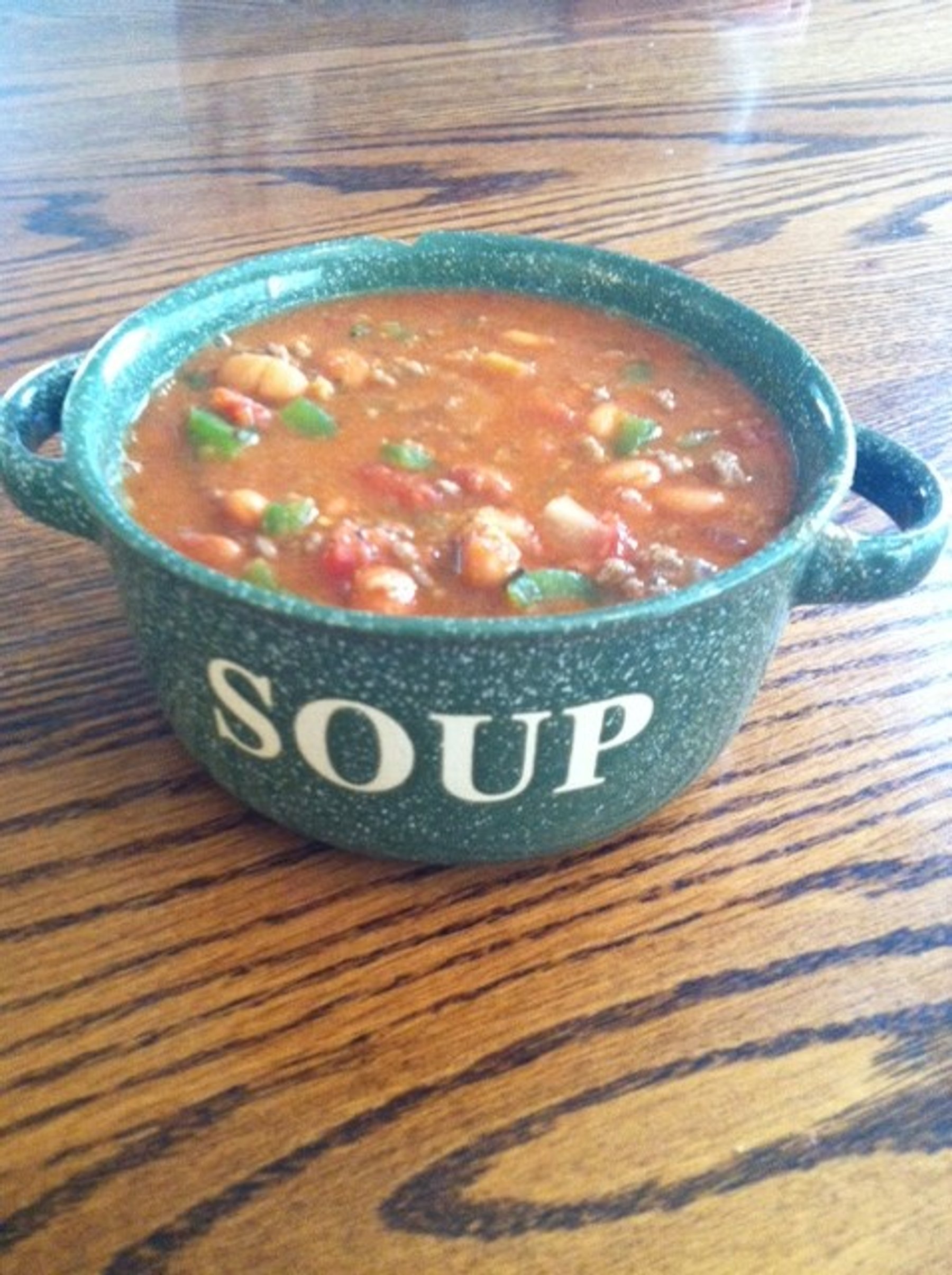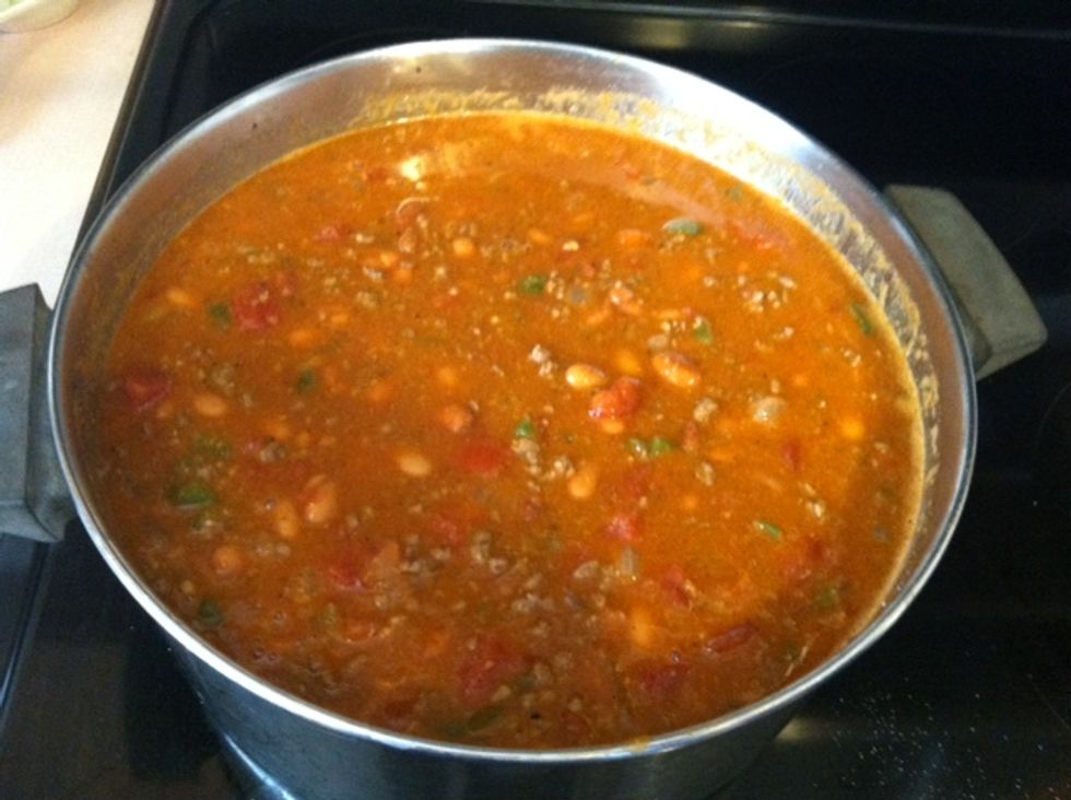 In lg pot cook ground beef, onion and green pepper. Season to taste.
