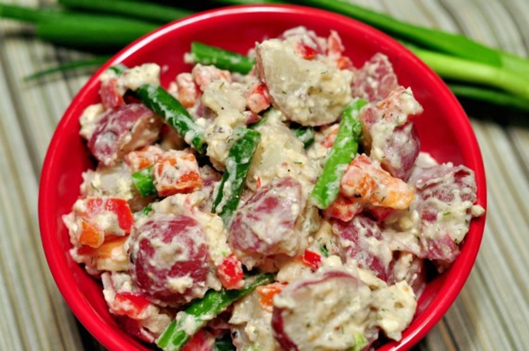 4 pounds small red potatoes, quartered, cooked, cubed about 1/2” 2 cups (16 oz..) plain yogurt 4 teaspoons Dijon mustard 3 Tbsp 4 tablespoons chopped fresh dill or 2 teaspoons dill weed 1/4 teaspoon ground black pepper 1 package (8 ounces) Crumbled Feta Natural Cheese 2 red peppers, diced 2 cups fresh green beans, ends removed and cut in half 4 tablespoons (about 3 stalks) green onions, ½ cup (about 6 stalks) chopped Salt to taste