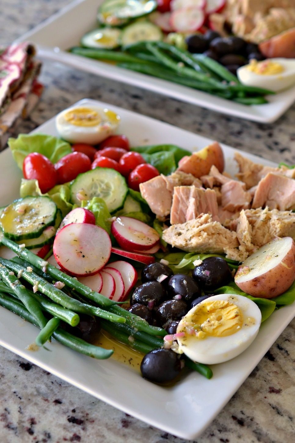 Nicoise Salad is a delectable cornucopia of fresh vegetables, Nicoise olives, red potatoes, hard boiled eggs and tuna drizzled with a tangy light mustard vinaigrette. It is not tossed but rather elegantly arranged on a platter or serving plate making it as pretty as it is delicious. The different array of flavor combinations comes together so well in this heart healthy salad.