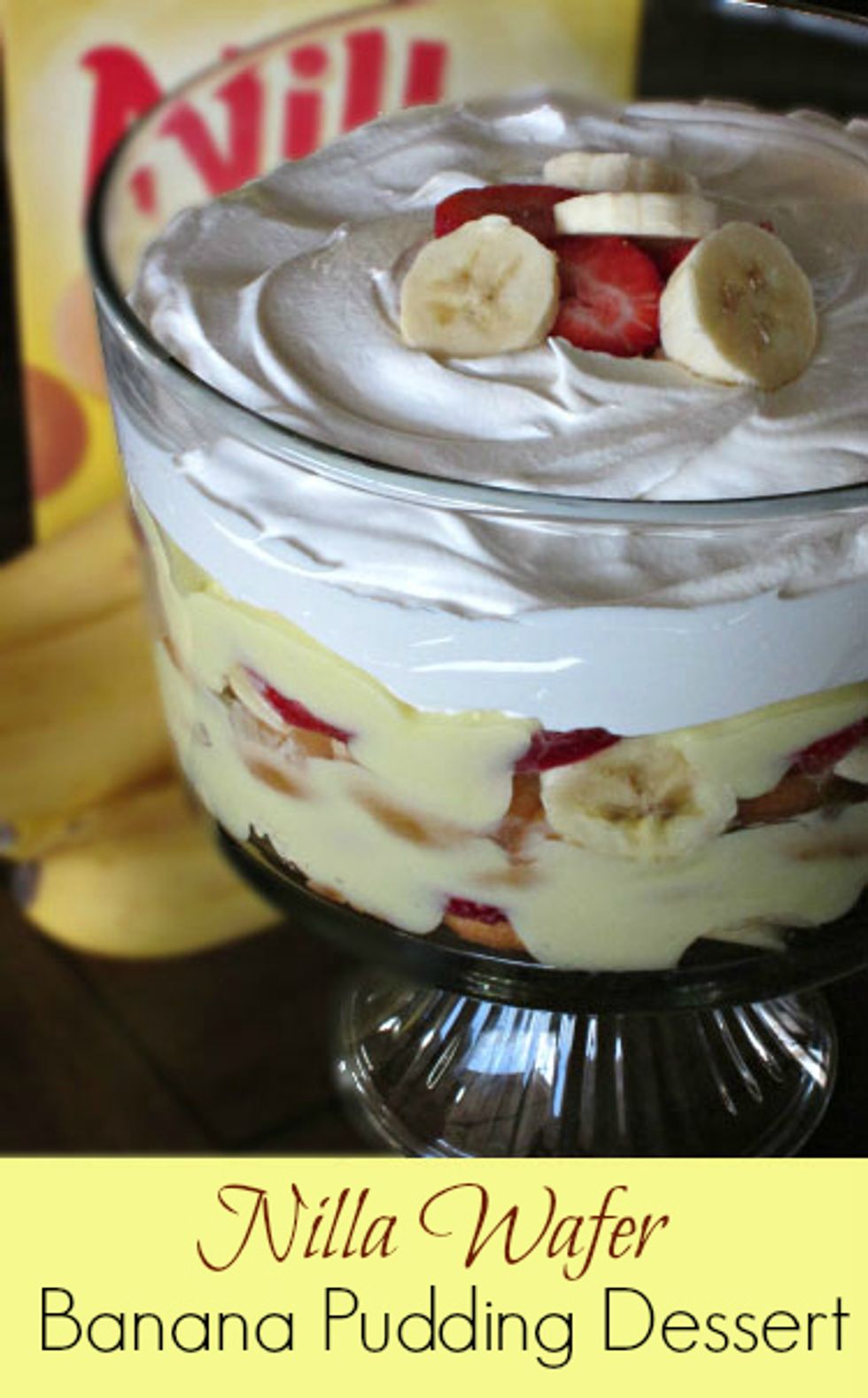 In a triffle dish, (or you can use a 9x13 casserole dish) line the bottom with a layer of vanilla wafers. Mix together the banana pudding and milk with a hand mixer until it starts to thicken.