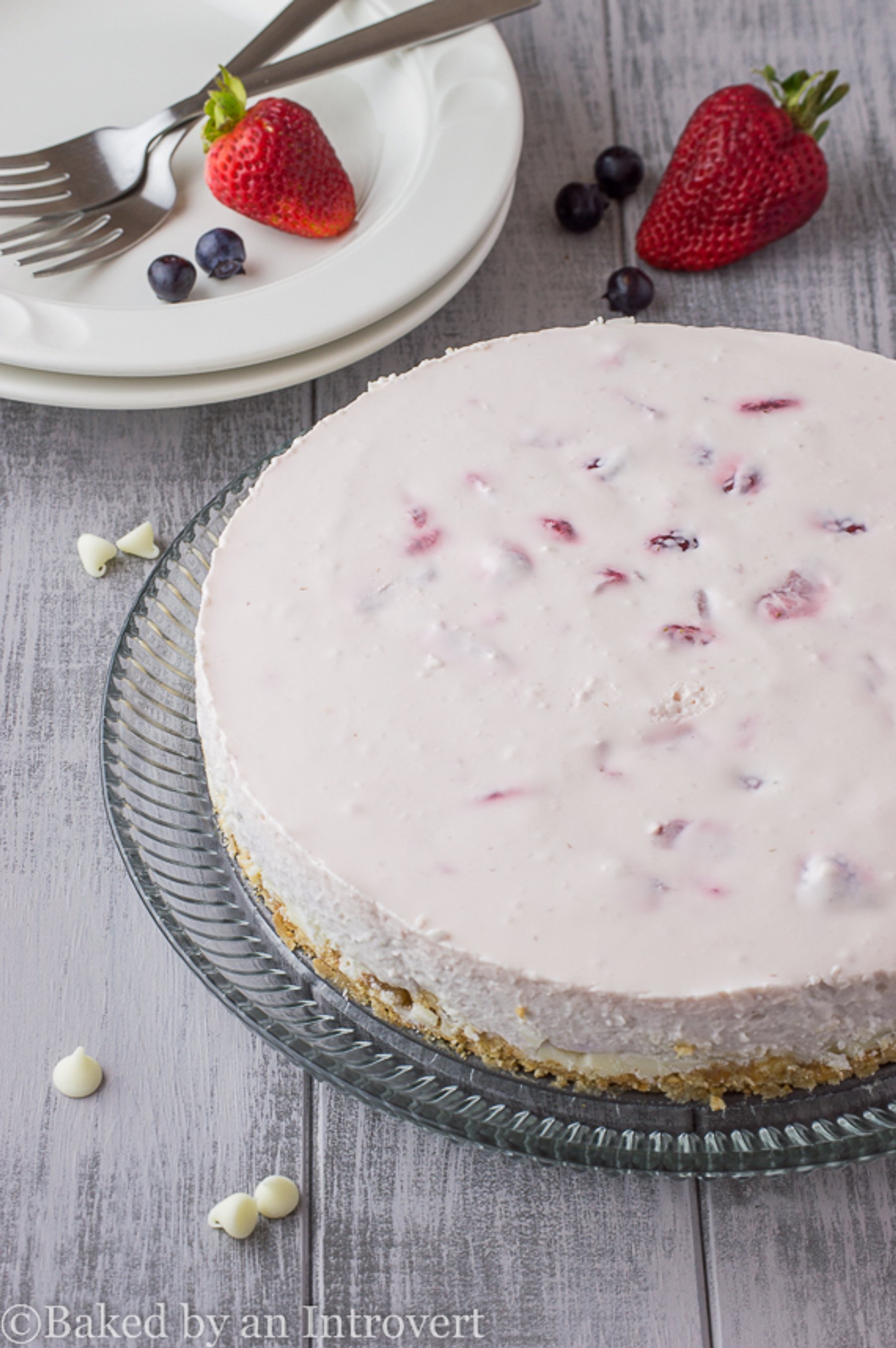 “Creamy no bake, double layer berry cheesecake. On top of buttery vanilla wafer crust brushed with white chocolate.”