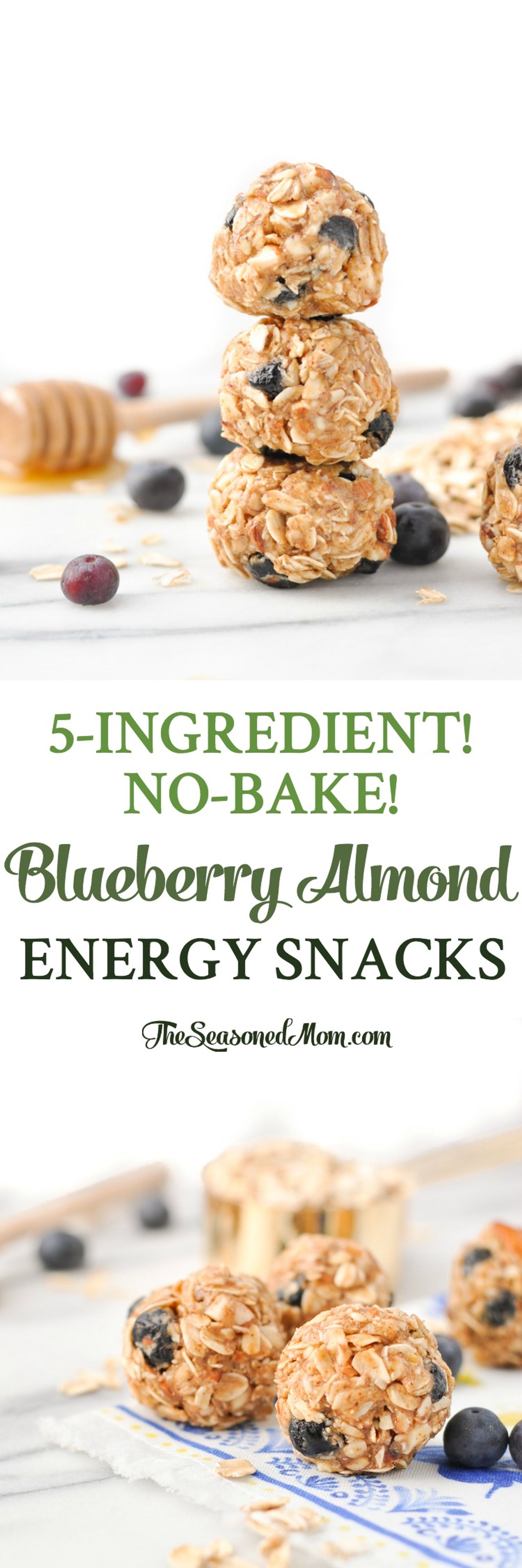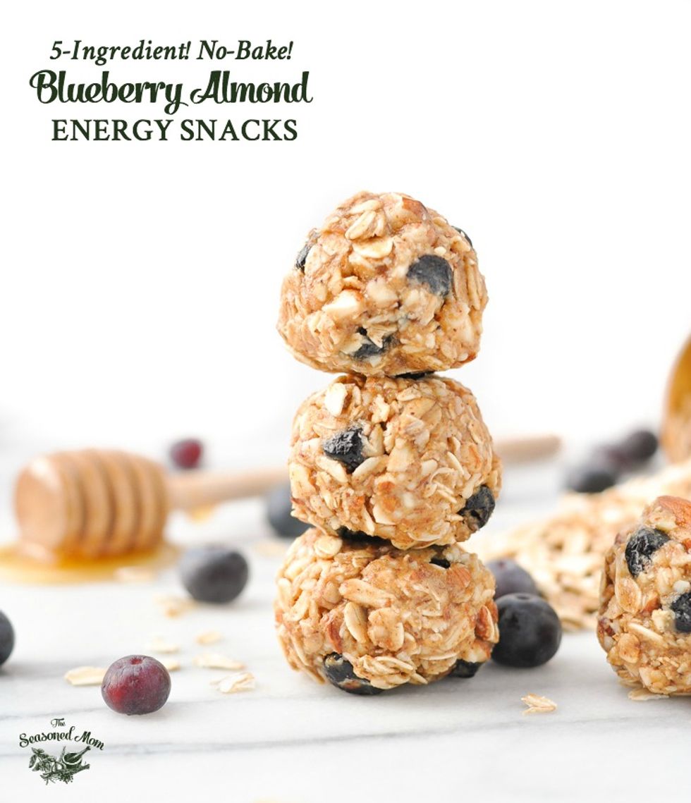 Keep your mid-day munchies healthy with these 5-Ingredient No-Bake Blueberry Almond Energy Snacks! In just 10 minutes you can stash a batch in your refrigerator for nutritious bites on the go. This versatile recipe is husband-and-kid-approved, making the snacks ideal for lunch boxes, commuter breakfasts, and pre-gym workout fuel!