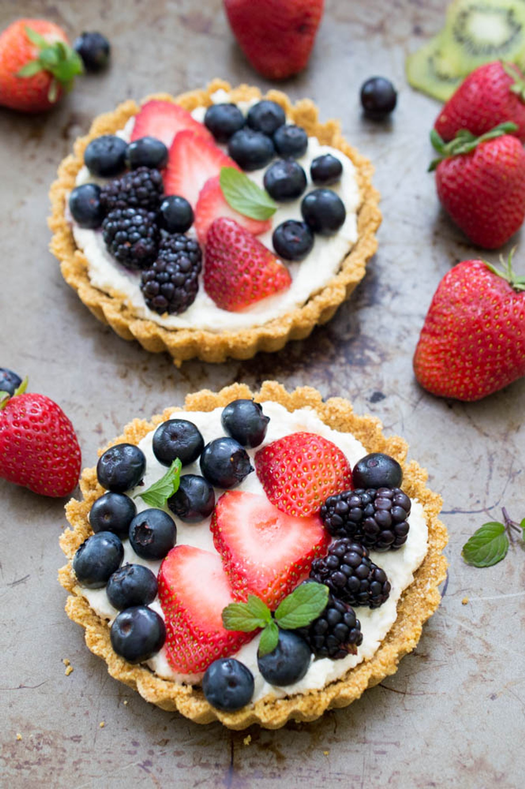 No Bake Mascarpone Fruit Tarts made with a homemade graham cracker crust and layered with fresh berries. A super colorful and easy make ahead dessert!