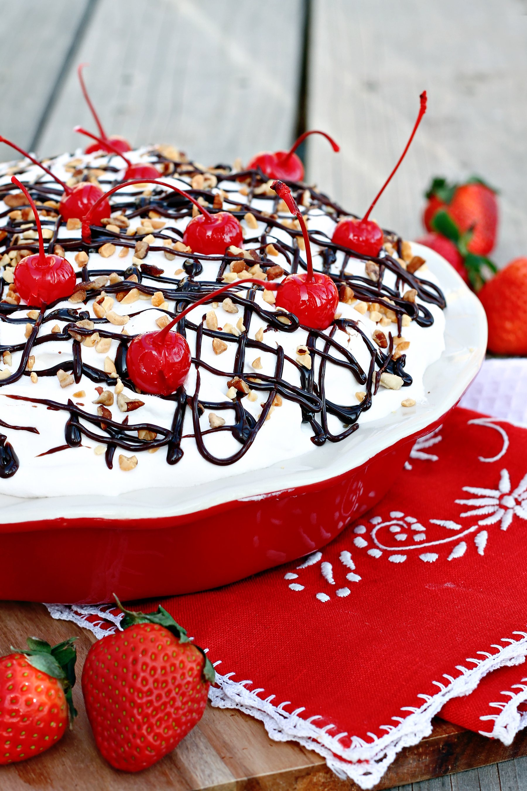 This no-bake pie features a cream cheese filling, along with all of your favorite banana split toppings. The perfect dessert for summer!