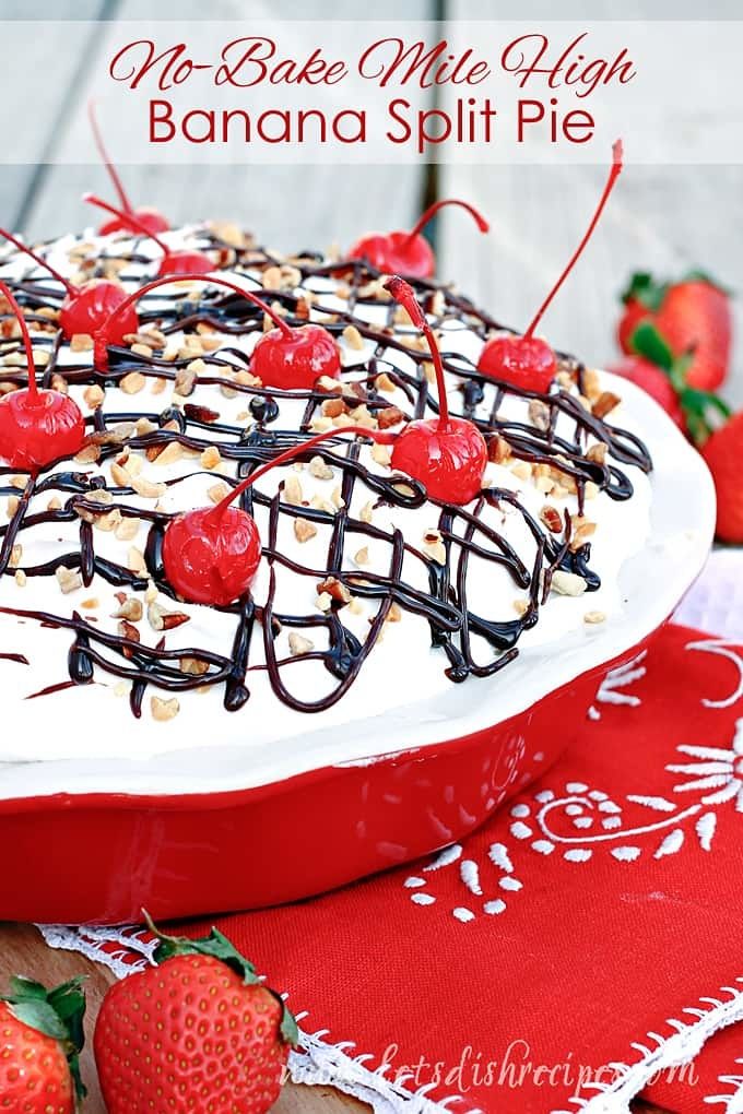 No-Bake Mile High Banana Split Pie: All of your favorite banana split toppings are piled high in this no-bake pudding pie dessert that's the perfect way to end any summer day!