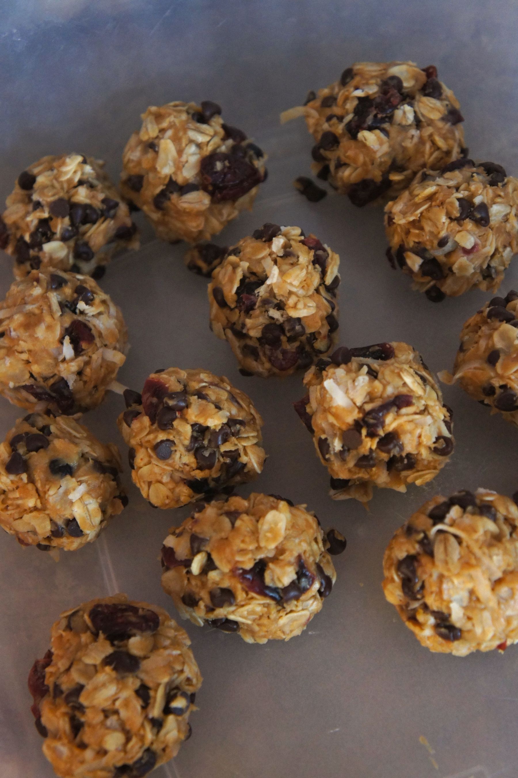 In a large bowl combine all of the ingredients well. Using a tablespoon, scoop out oat mixture and roll into a ball. If it is too sticky to roll in a ball, refrigerate to firm up a bit, about 1/2 hour, then...