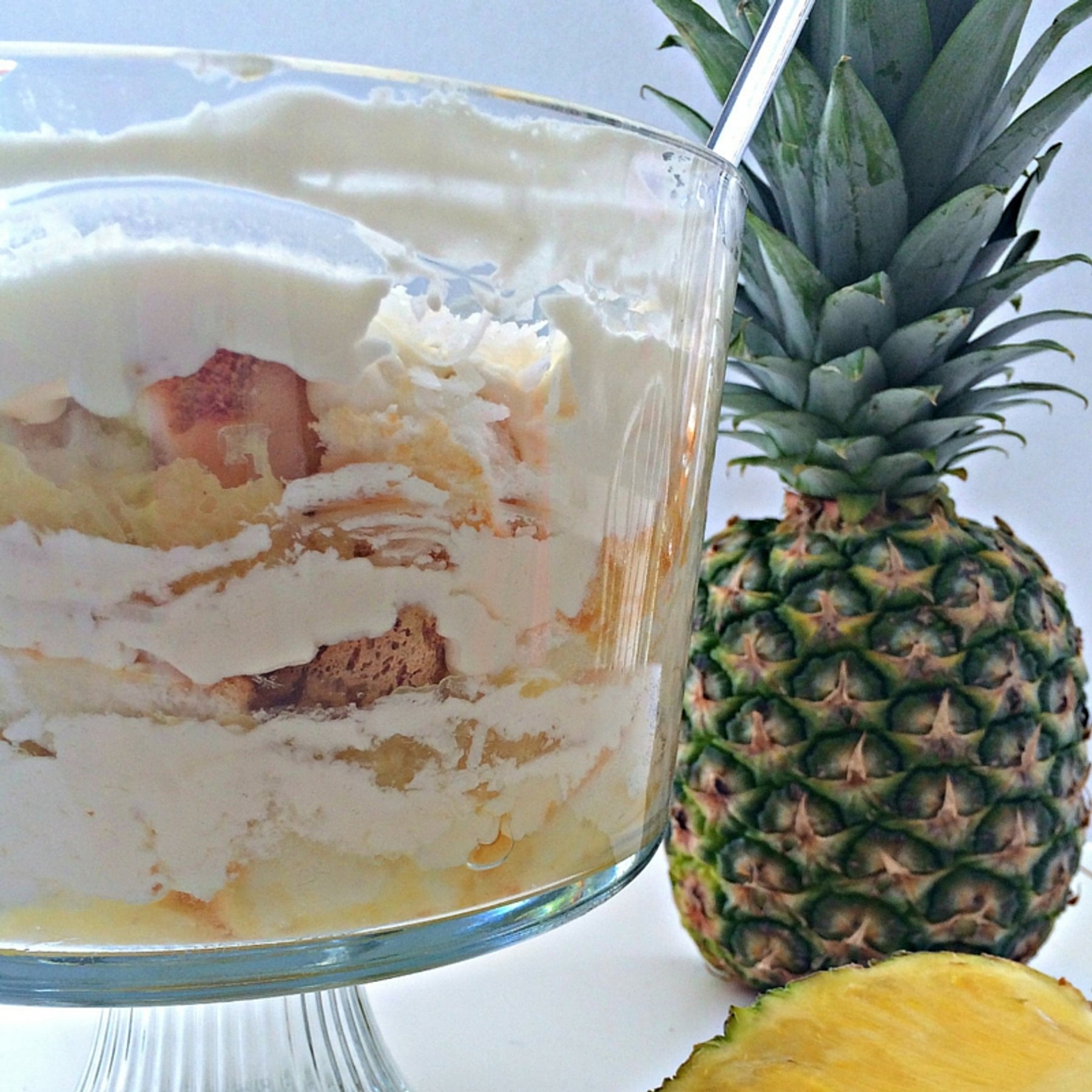 Homemade whipped cream, crushed pineapple, coconut and angel food cake make this trifle the perfect summer dessert!