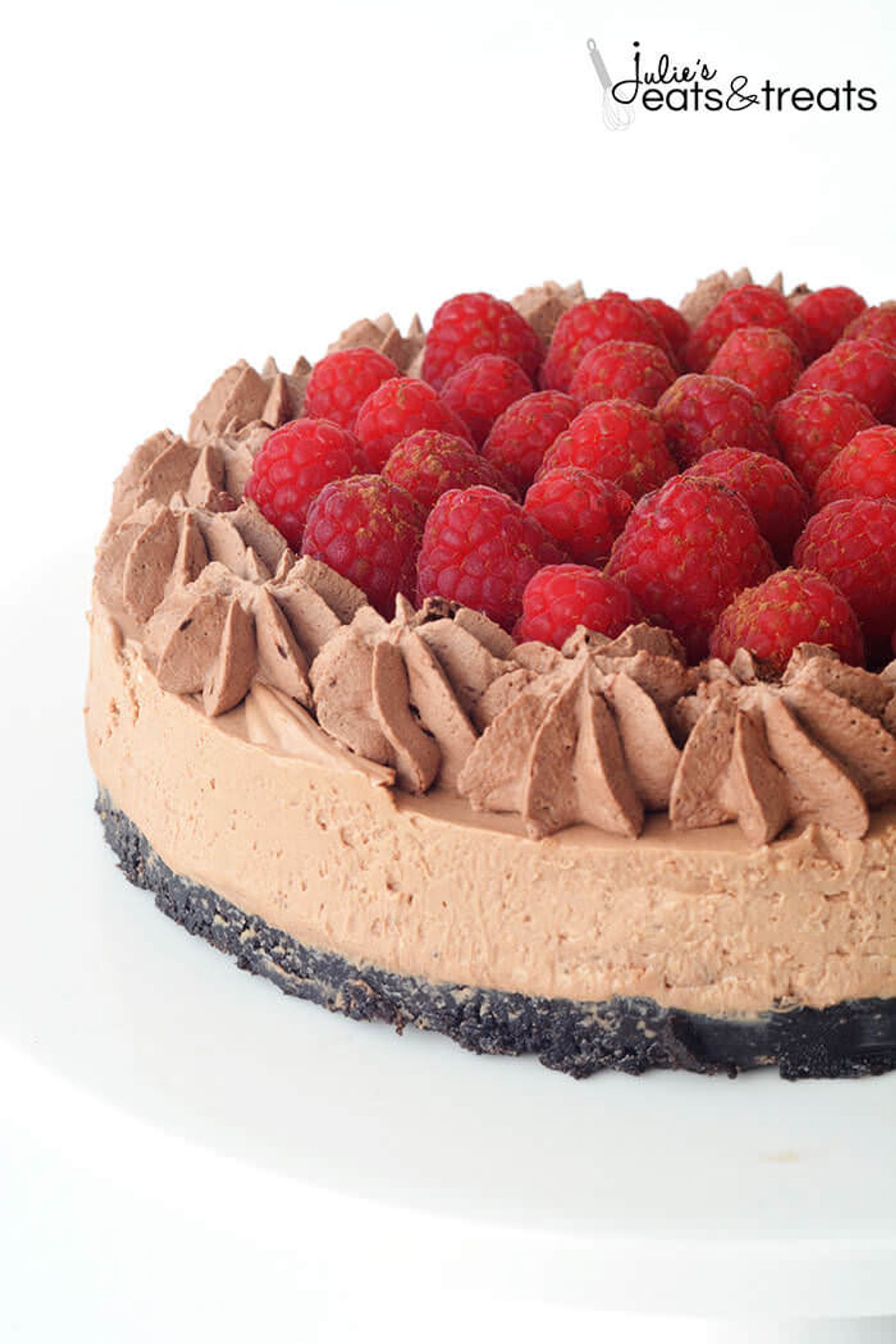 No Bake Raspberry Chocolate Cheesecake ~ Delicious, Easy Chocolate Cheesecake with a Delicious Oreo Crust, Creamy Chocolate Cheesecake and Topped with Fresh Raspberries and Chocolate Whipped Cream!