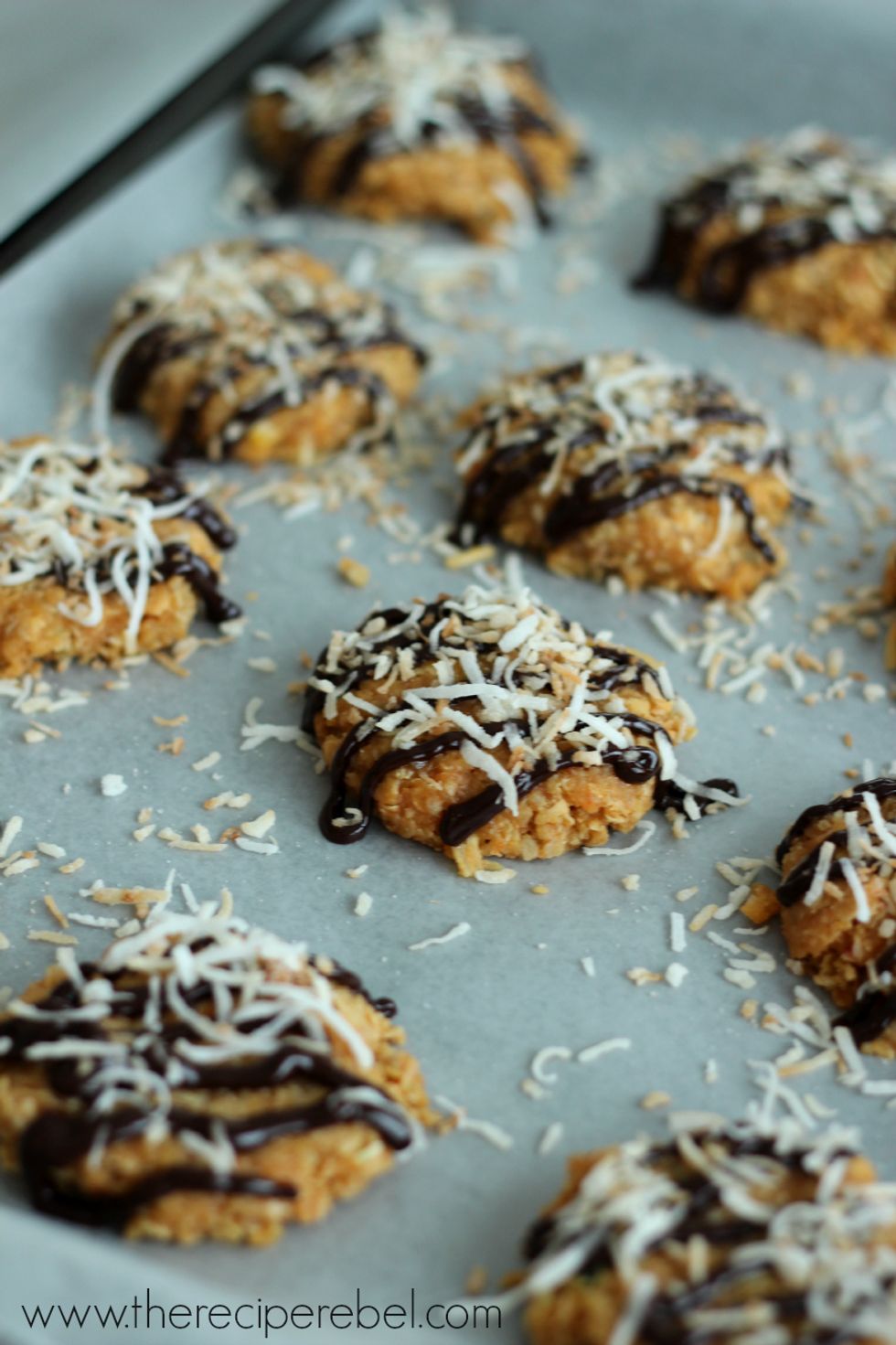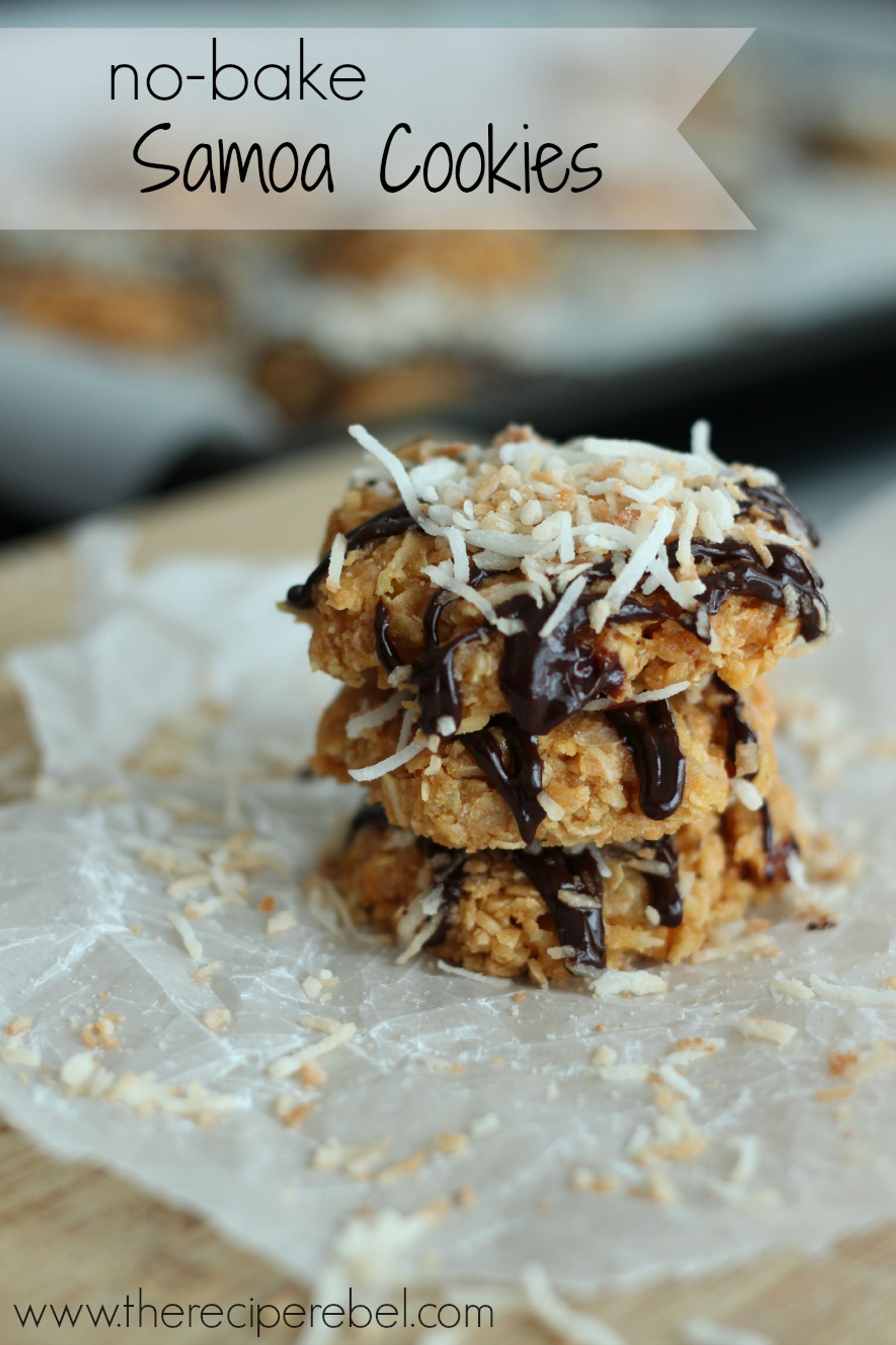 Delicious Samoa-inspired no-bake cookies using butterscotch pudding, coconut, chocolate drizzle and toasted coconut.