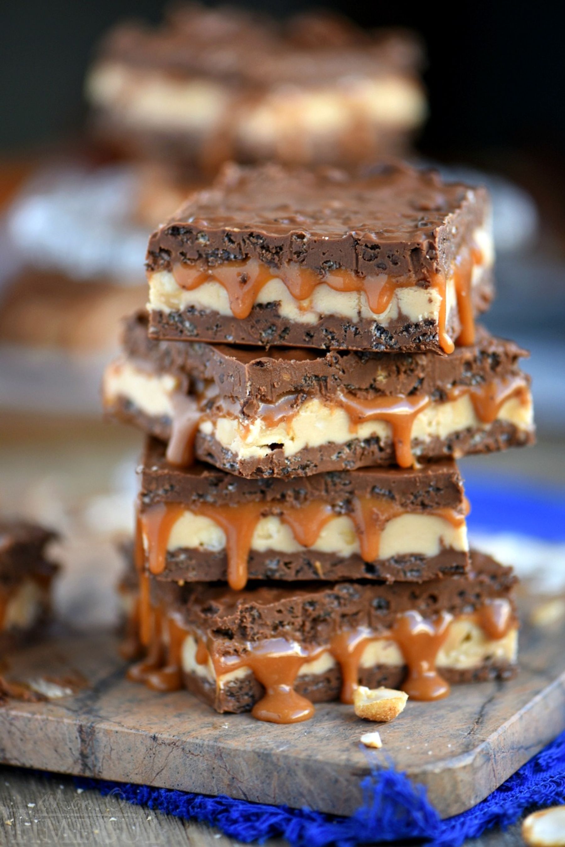 No Bake Snickers Crunch Bars are sure to become a new favorite! Layers of chocolate mixed with crunchy Cocoa Pebbles, irresistible nougat, and gooey caramel are impossible to resist! This recipe makes a lot so be sure to invite friends and family over to enjoy with you! Great for parties!