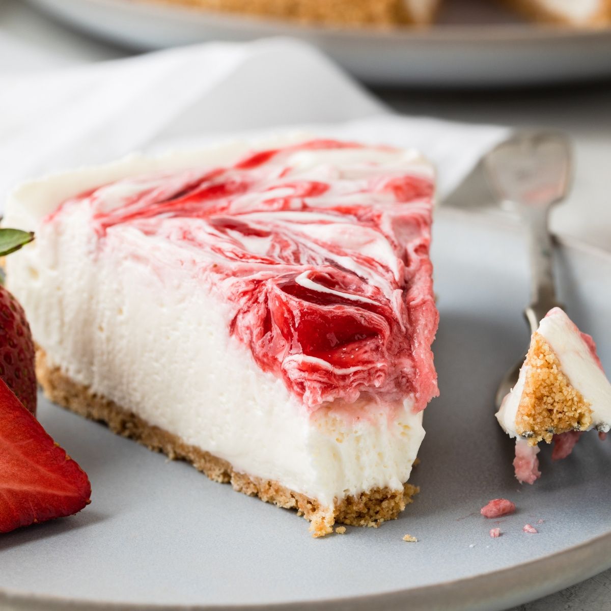 This No Bake Strawberry Cheesecake is supremely creamy and made with fresh strawberry jam that is swirled over the top. No gelatin is needed for this decadent summer treat.