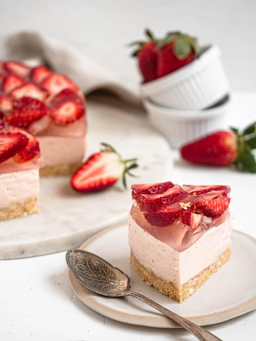 No-bake strawberry cheesecake with a buttery shortbread crust, a creamy cheesecake filling, fresh strawberries and a refreshing lemon jelly.