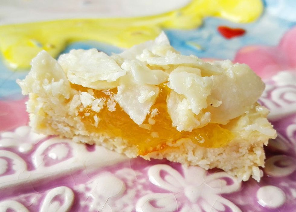 Mix all ingredients together except for the jam and the coconut flakes.