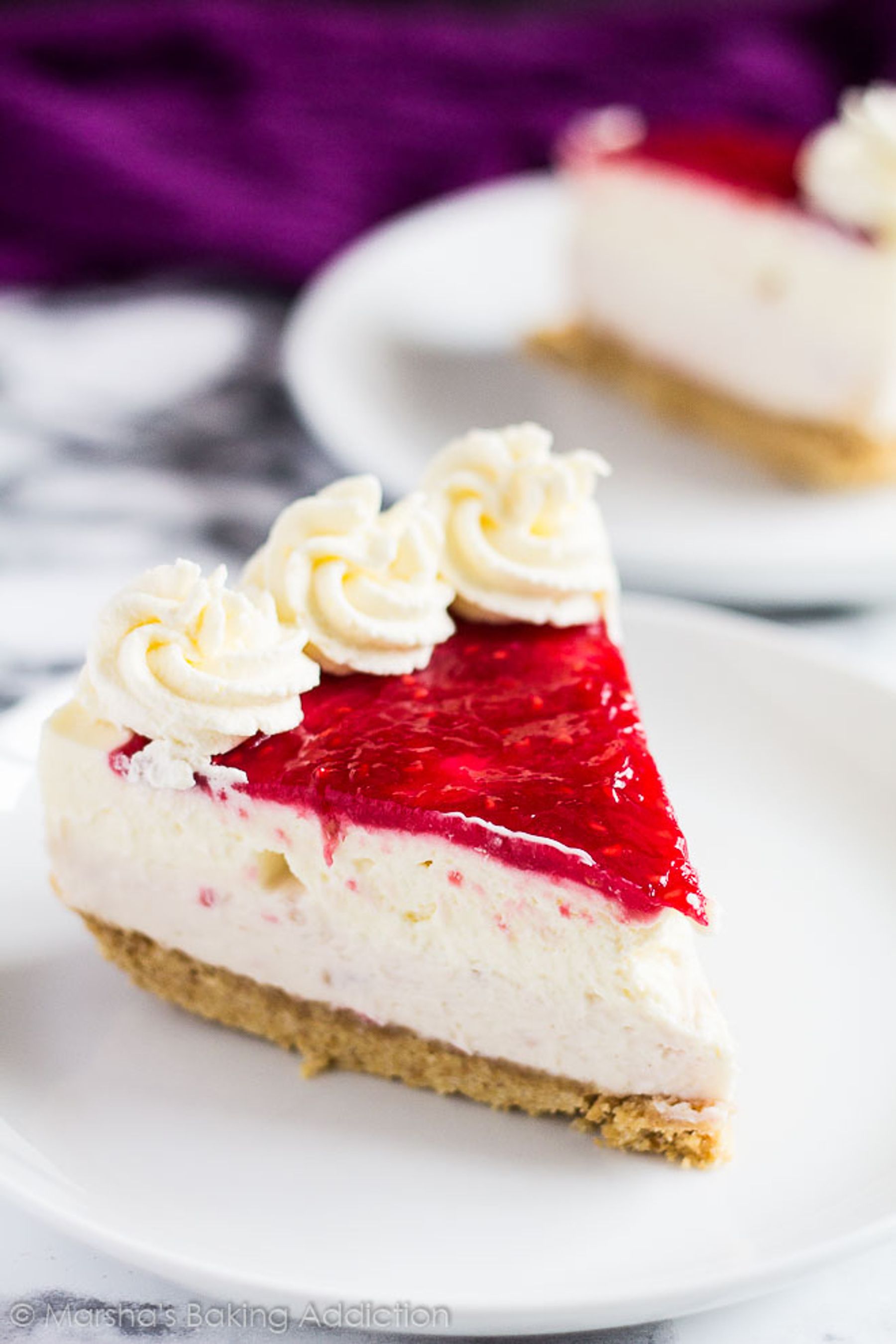 Scrumptiously creamy no-bake white chocolate cheesecake infused and topped with fresh raspberry sauce and whipped cream!