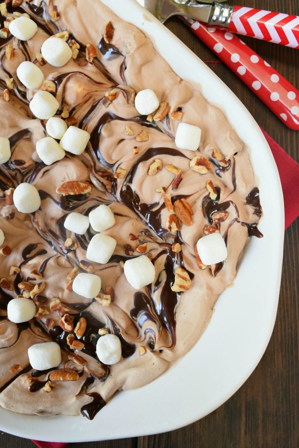 This No Churn Rocky Road Ice Cream is fully loaded with great flavor, extra marshmallows, and fudge swirls on top!
