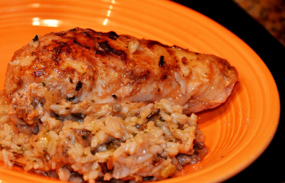 Place chicken on top of rice mixture. Cover with aluminum foil.